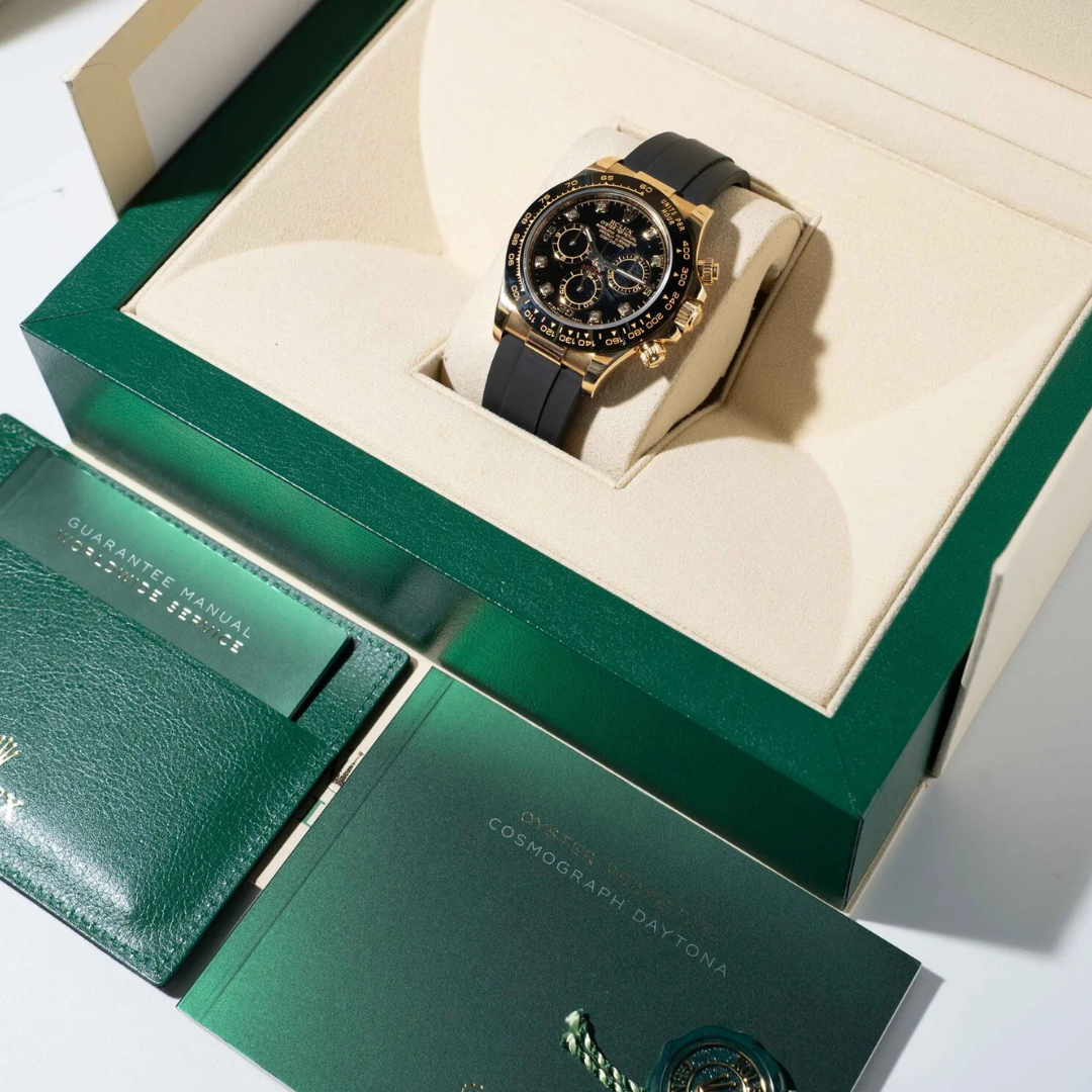 A Rolex Daytona Watch, 18ct Yellow Gold Case & Clasp with a Black Rubber Strap and a Black Bezel on a Black Dial with Diamond Numerals.