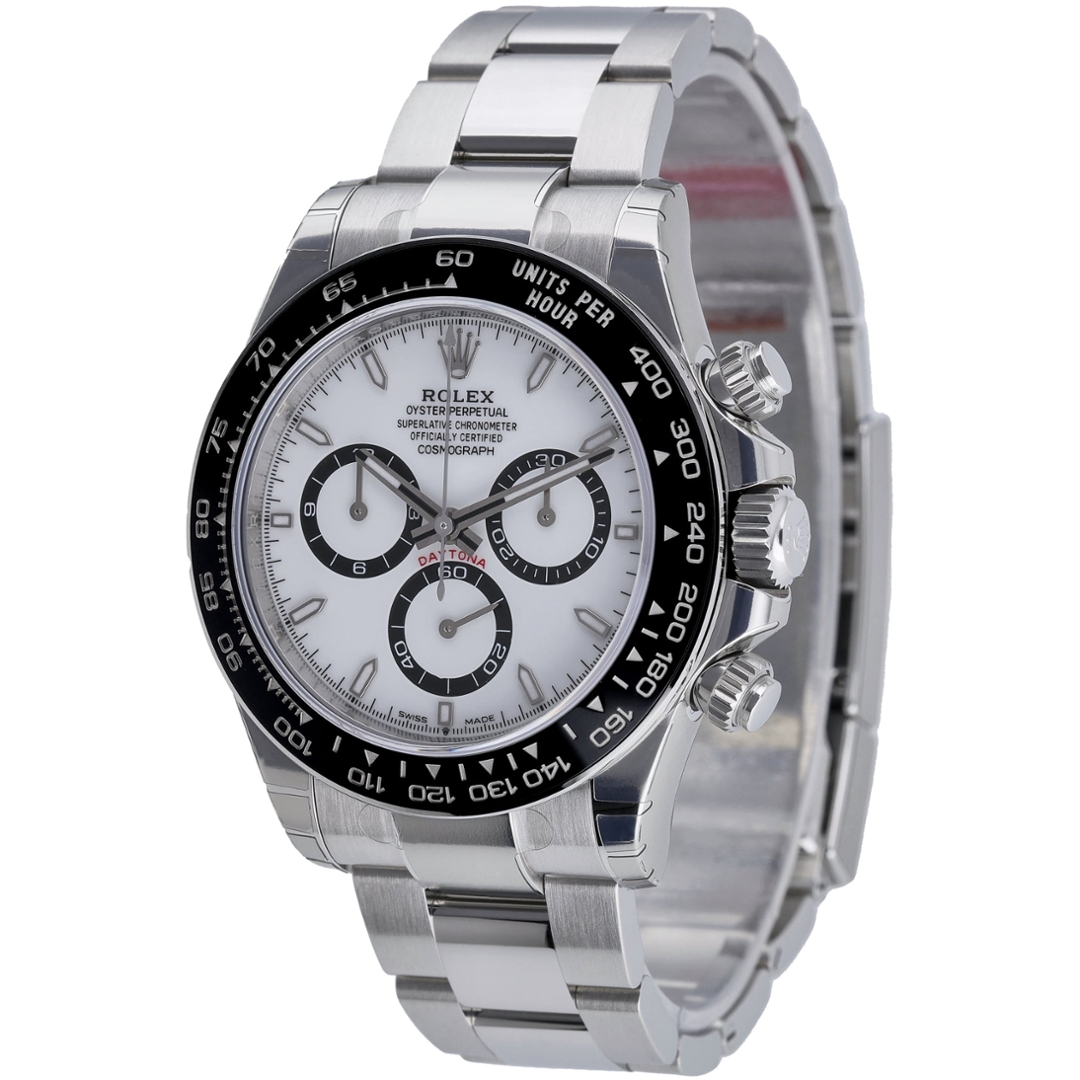 A Rolex Daytona "Panda" 126500LN, crafted in stainless steel with a black Cerachrom bezel and crisp white dial featuring black subdials — the ultimate modern take on one of the most iconic chronographs ever produced. Measuring 40mm, this model strikes the perfect balance between sportiness and sophistication, delivering a bold yet timeless look that's instantly recognisable.