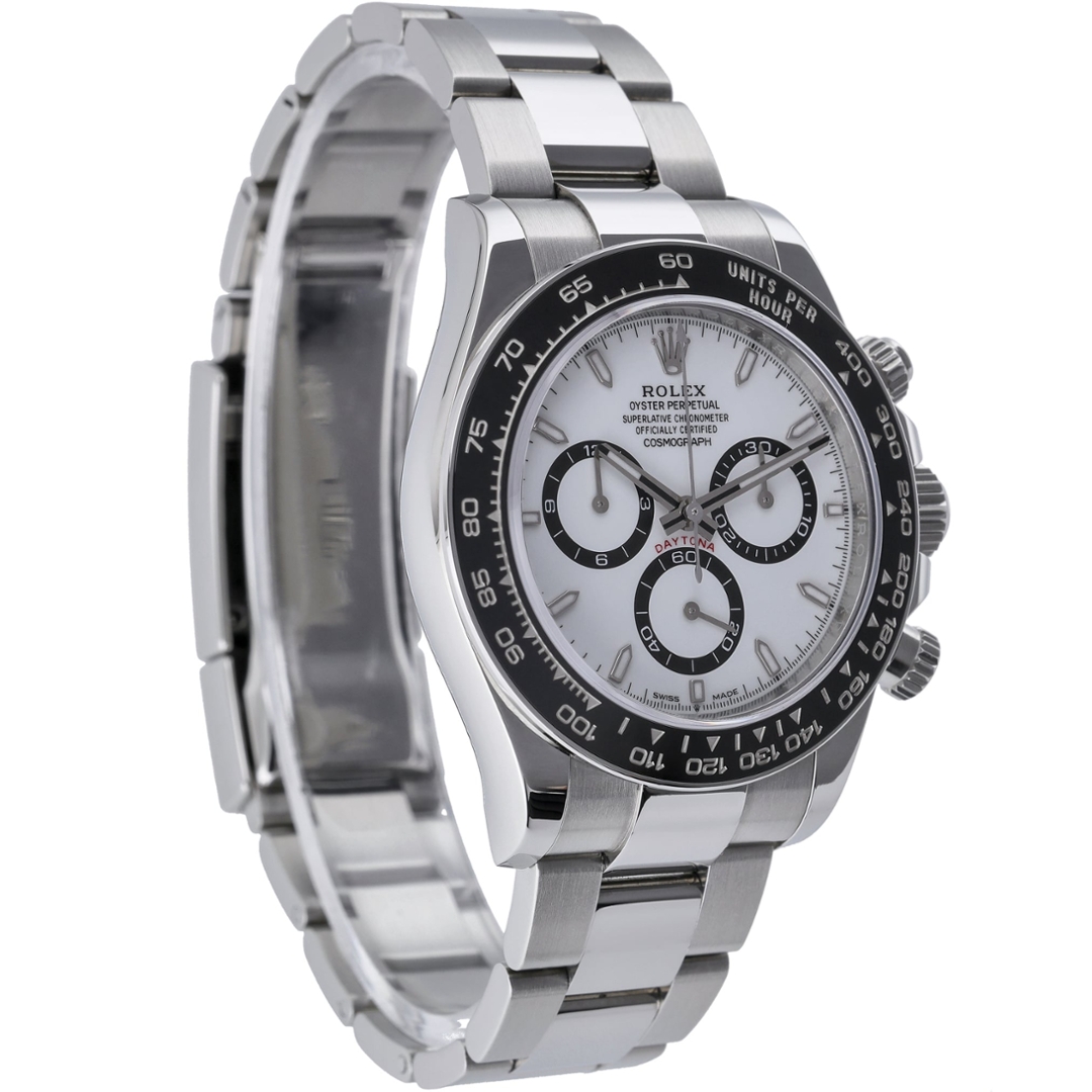 A Rolex Daytona Watch, Stainless Steel with a Black Bezel and a White Dial.