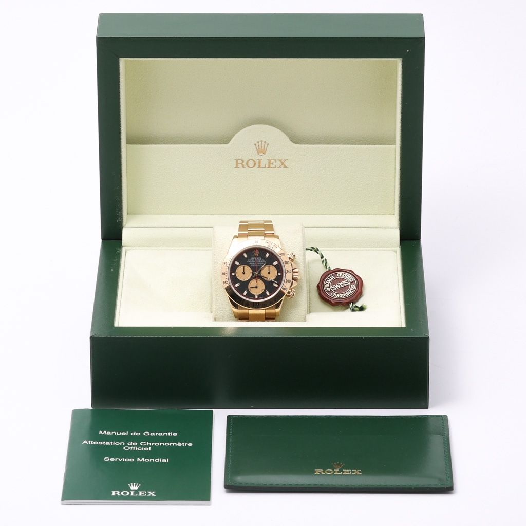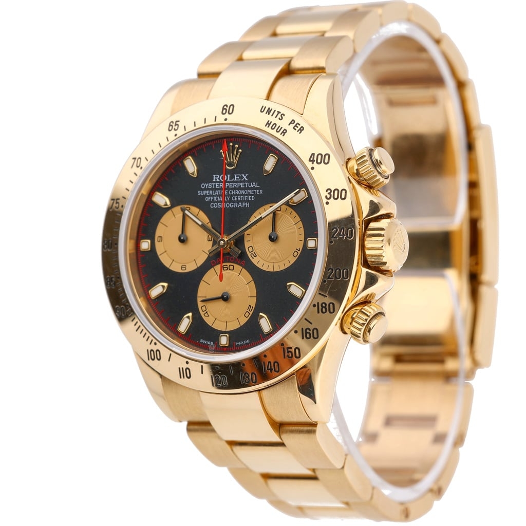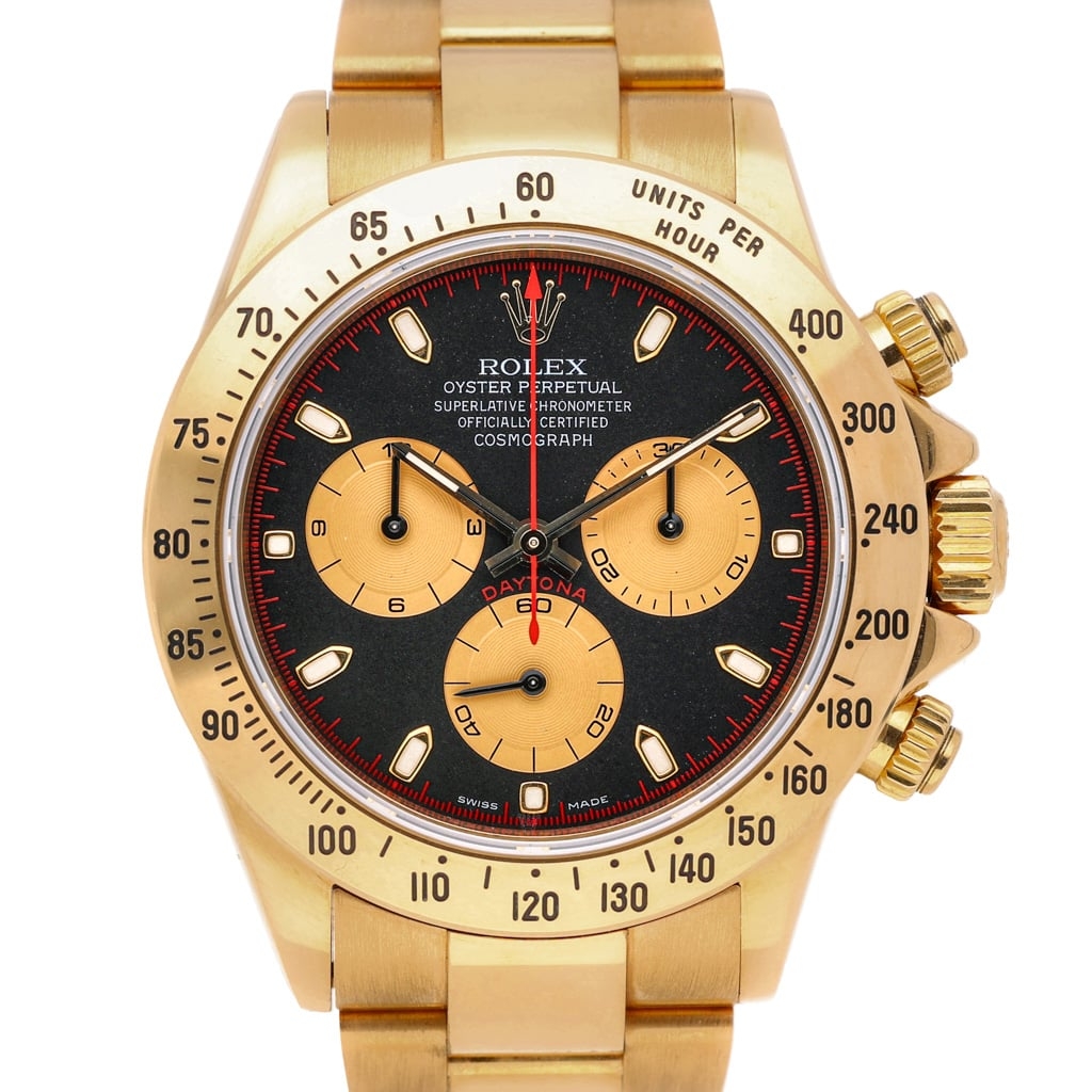 A Rolex Daytona, model 116528, is crafted entirely in 18ct yellow gold, delivering unmistakable presence on the wrist. The 40mm case is paired with a matching gold Oyster bracelet and engraved tachymeter bezel, reinforcing its sporting heritage while maintaining a strong sense of luxury. The black dial creates a striking contrast, elevated by gold sub-dials and subtle red accents that enhance both depth and character.