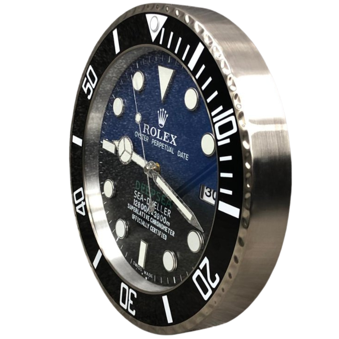A striking stainless steel replica Rolex DeepSea Sea-Dweller wall clock, designed to capture the unmistakable presence of one of the world’s most iconic dive watches. Featuring a bold black and blue gradient “Deepsea” dial, luminous-style hour markers, and the signature unidirectional bezel design, this piece delivers exceptional visual impact in any setting. The sweeping second hand provides a smooth, continuous motion, enhancing its premium feel.