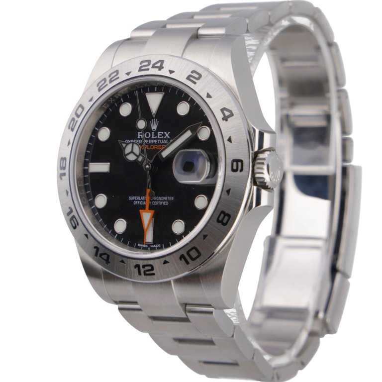 A Rolex Explorer II Watch, model 216570, in robust stainless steel with a striking black dial and signature orange 24-hour hand. This 2020 model features a generous 42mm case size, designed for ultimate legibility and durability in the harshest environments. It houses Rolex’s in-house calibre 3187 automatic movement, known for its shock resistance, precision, and dual time zone functionality—ideal for explorers, adventurers, and world travellers alike.