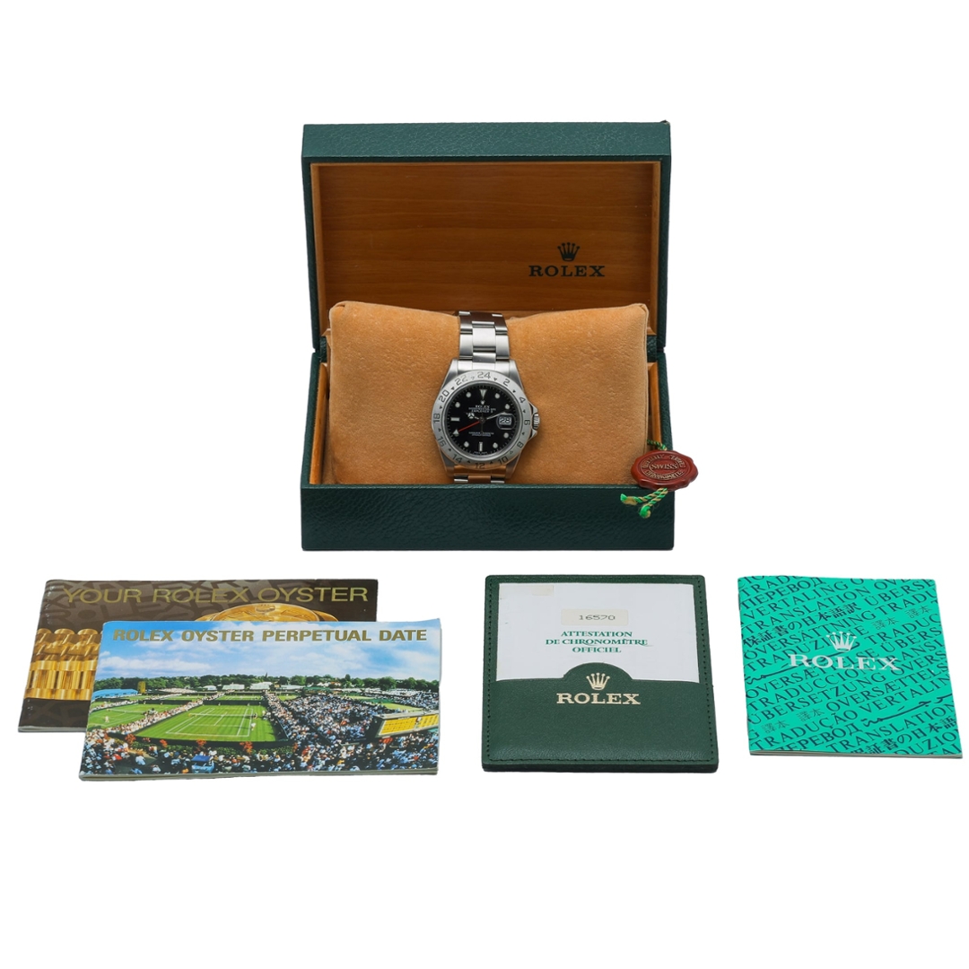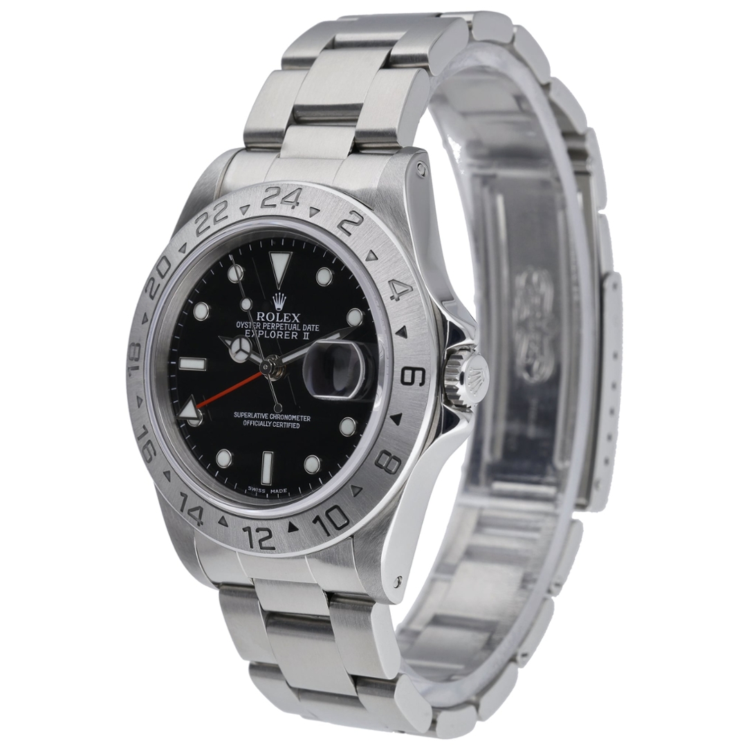A Rolex Explorer II from 1993 is a classic example of Rolex’s purpose-built tool watch design, originally developed for spelunkers and explorers operating in low-light environments. The 40mm stainless steel case is paired with a clean black dial, fixed 24-hour bezel, and the signature orange GMT hand, offering excellent legibility and timeless functionality.