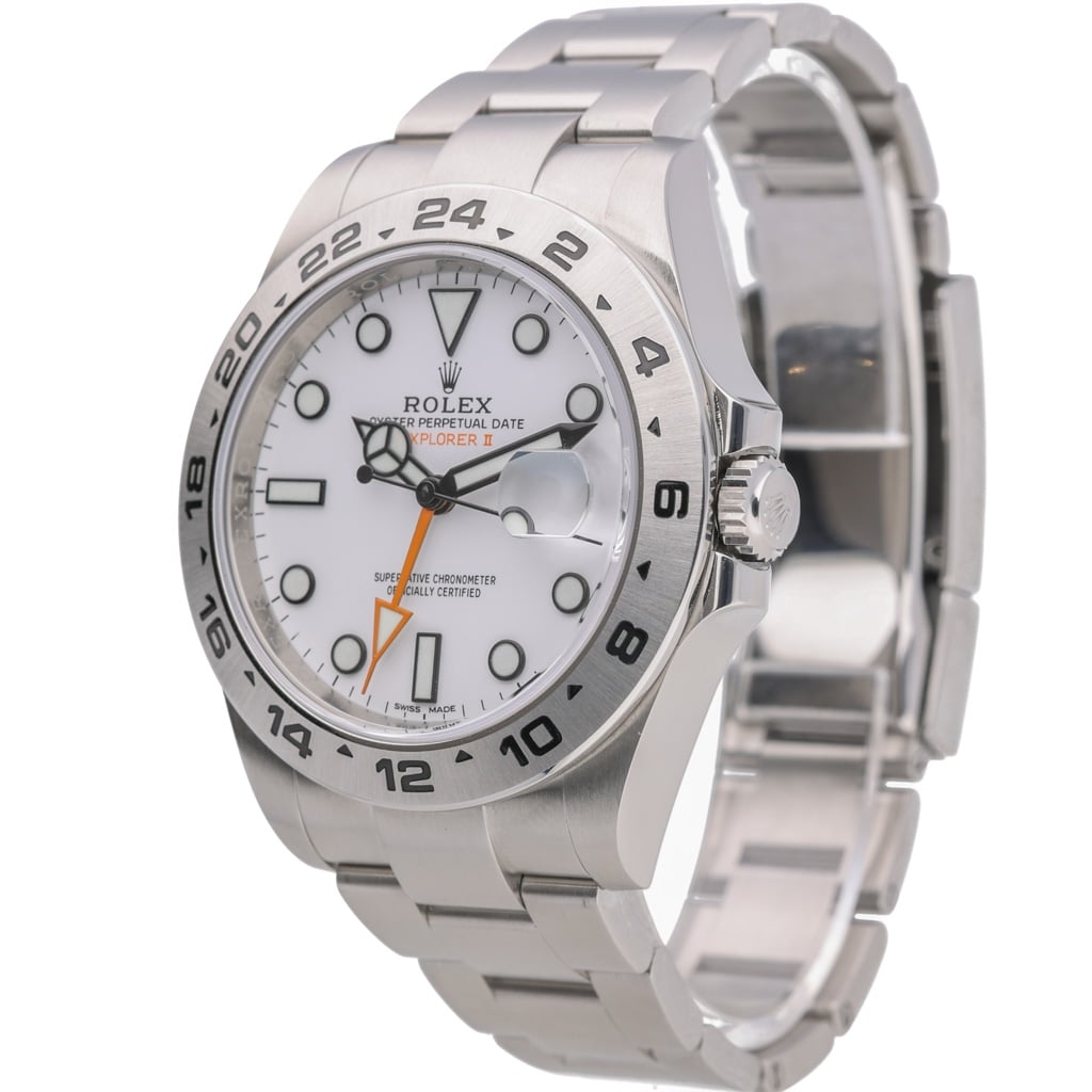 This Rolex Explorer II reference 216570 is a robust, highly legible professional model designed for extreme environments and long-range exploration. The 42mm stainless steel Oyster case offers strong wrist presence while remaining balanced and wearable, complemented by the fixed brushed steel 24-hour bezel. The crisp white dial provides exceptional contrast, enhanced by bold luminous hour markers and the signature orange 24-hour hand that defines the Explorer II lineage.