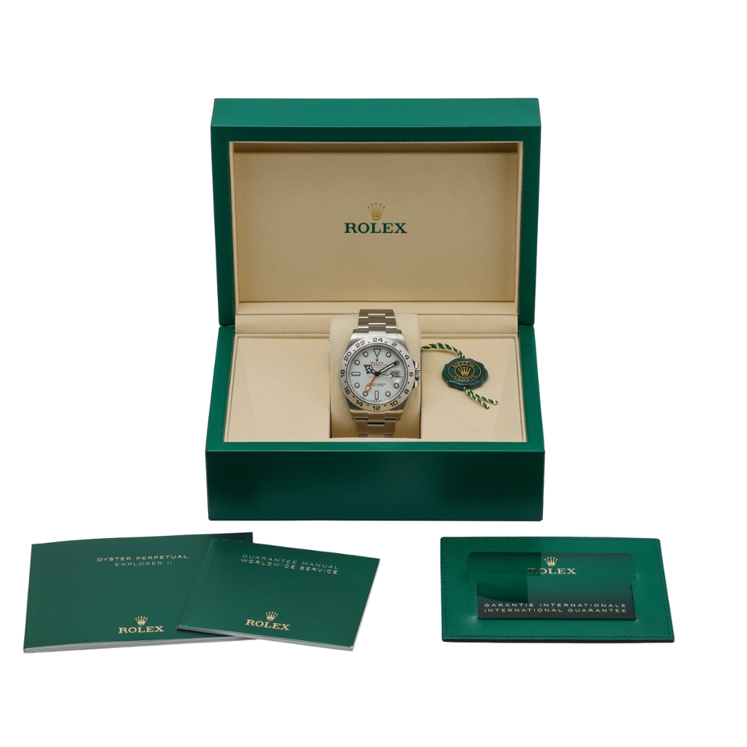This Explorer II is presented in immaculate condition and comes fully boxed and certified with its original paperwork. Backed by the Rolex Manufacturer Warranty until 2031, it offers both professional functionality and refined Rolex craftsmanship—making it an ideal companion for both seasoned adventurers and discerning collectors alike.