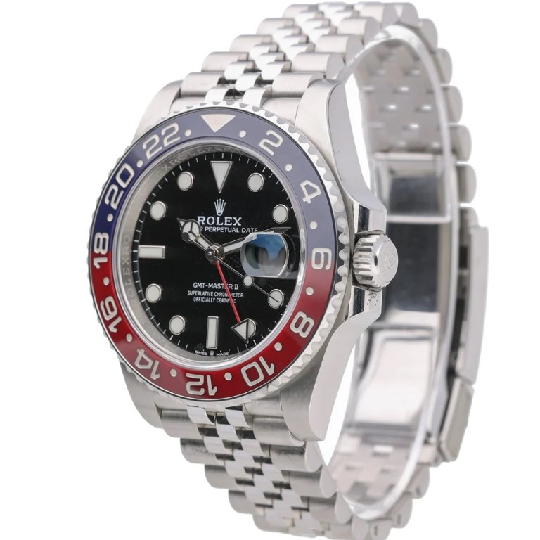 A Rolex GMT-Master II Watch, Stainless Steel with a Blue/Red Bezel and a Black Dial.