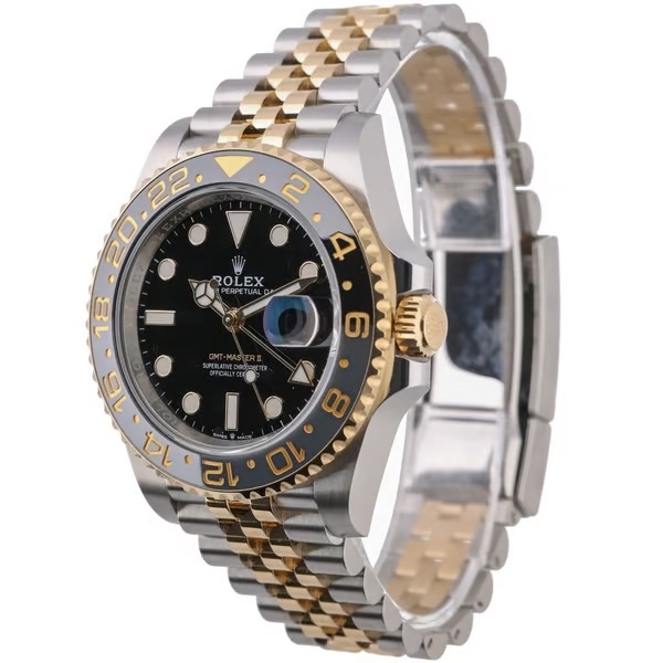 A Rolex GMT-Master II, model 126713GRNR, is a stunning bi-metal timepiece from 2024, combining the robustness of stainless steel with the luxury of 18ct yellow gold. This immaculate 40mm watch features an elegant black bezel and dial, exuding both sophistication and versatility, making it perfect for any occasion.