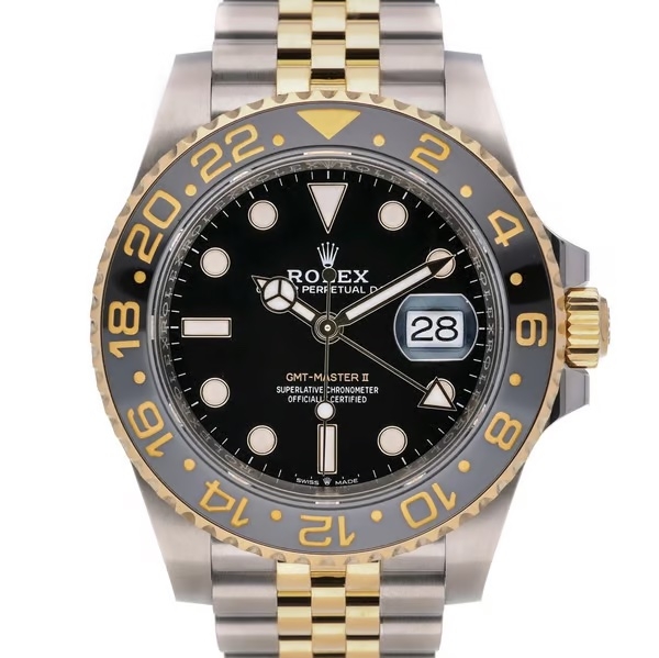 A Bi-Metal Rolex GMT-Master II Watch, Stainless Steel and 18ct Yellow Gold with a Black Bezel & Dial.