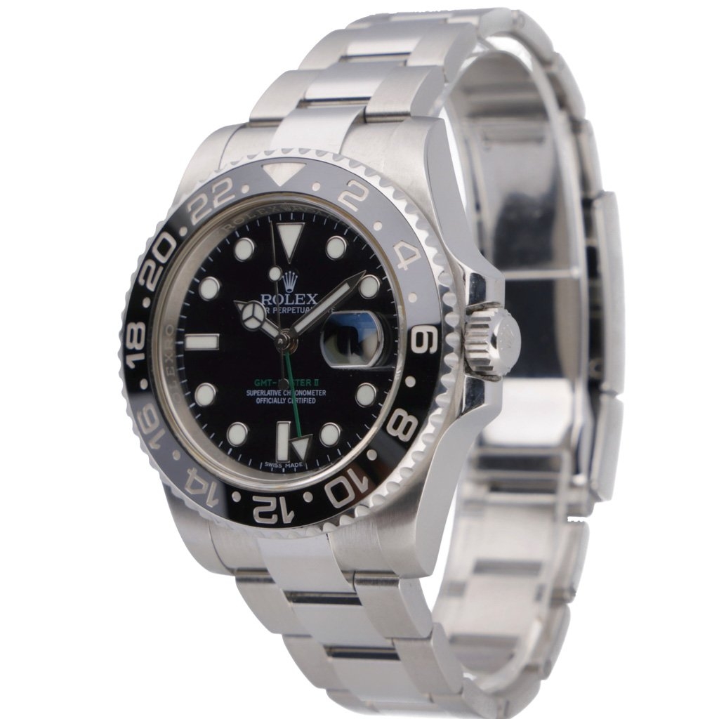 A Rolex GMT-Master II Watch, Stainless Steel with a Black Bezel and Dial.