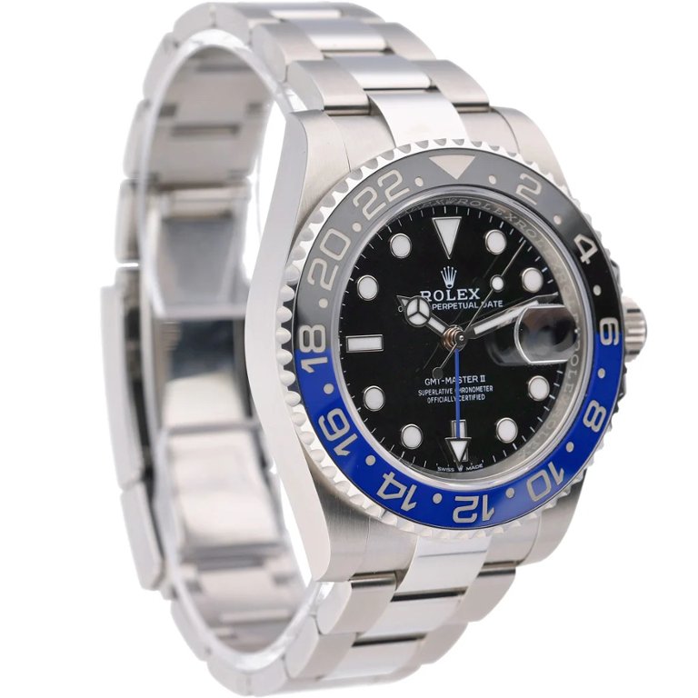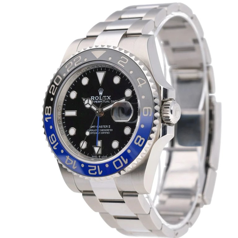 A Rolex GMT-Master II 126710BLNR is presented in stainless steel with a black dial and the instantly recognisable black-and-blue Cerachrom bezel. The 40mm Oyster case offers balanced proportions, while luminous hour markers, Mercedes hands, and the Cyclops date window provide clear, reliable legibility. Fitted to the Jubilee bracelet, the watch delivers a refined yet sporty presence on the wrist.