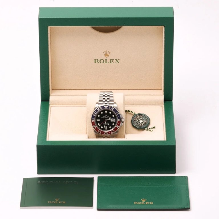 Powered by the Rolex Calibre 3285 automatic movement, the model delivers excellent accuracy and a robust 70-hour power reserve. Independent hour-hand adjustment and the patented Chronergy escapement ensure the watch performs reliably in all conditions, whether worn daily or while travelling. The Chromalight display enhances clarity in low-light environments, reinforcing the GMT-Master II’s reputation for practical, purpose-built design.