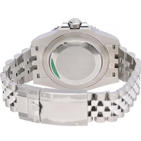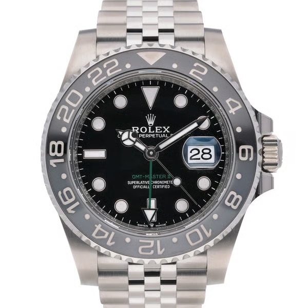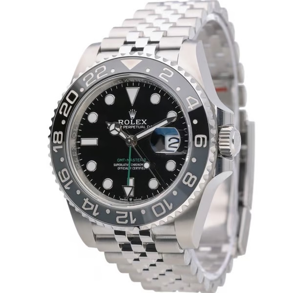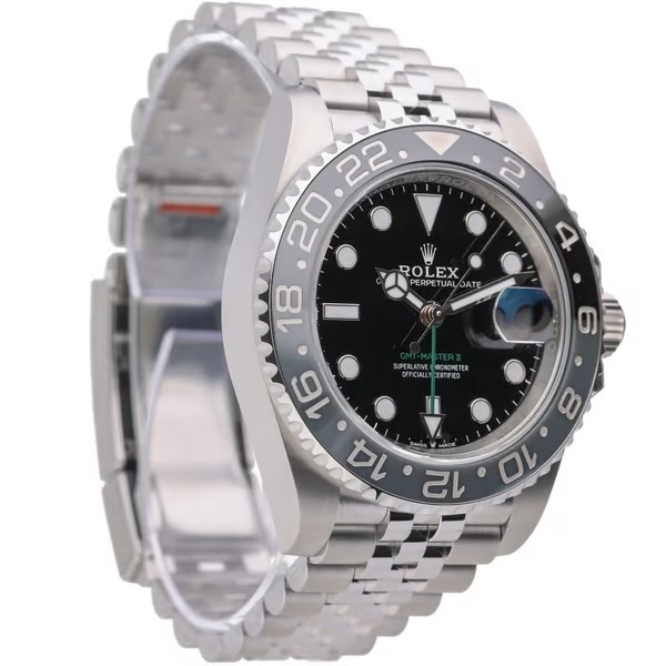 A Rolex GMT-Master II, model number 126710GRNR, is a 2024 release that perfectly blends form and function. This luxury timepiece features a 40mm stainless steel case, embodying both strength and sophistication. Its sleek black dial pairs with a matching black-and-grey bezel, creating a bold yet timeless aesthetic.