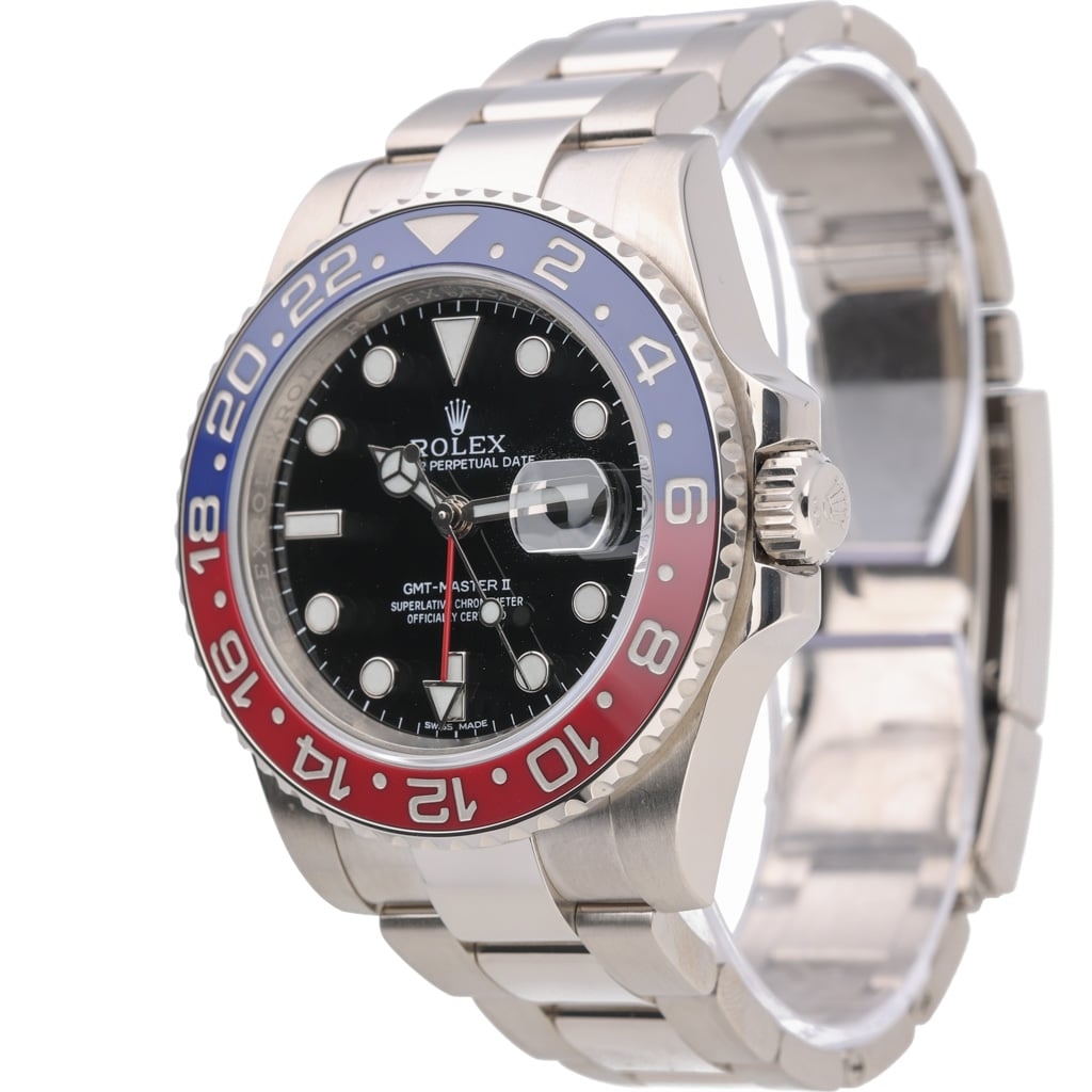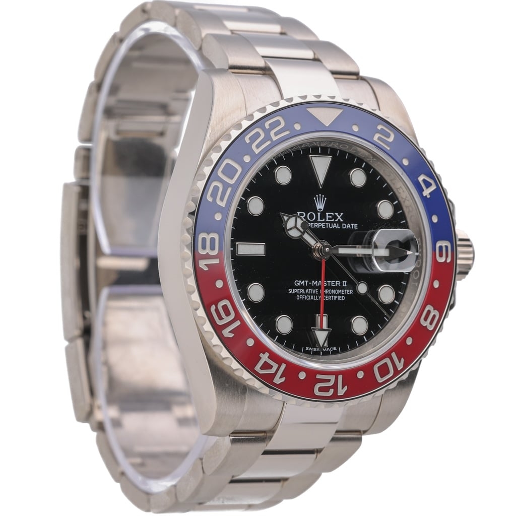 A Rolex GMT-Master II 116719BLRO, crafted entirely from 18ct white gold, is a true statement of exclusivity and prestige. Featuring the iconic blue and red Cerachrom bezel, known as the "Pepsi," and a sleek black dial.