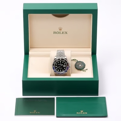 A Rolex GMT-Master II 126710BLNR, known as the "Batman," is a modern icon in the world of luxury watches. Crafted in stainless steel, this 2021 model features a striking black-and-blue ceramic bezel that perfectly complements the sleek black dial.