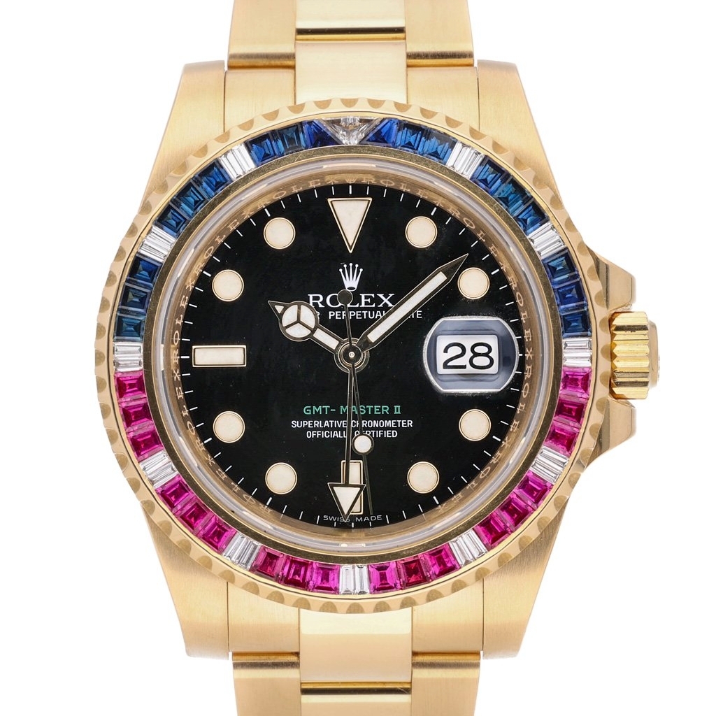 A Rolex GMT-Master II Watch, Full 18ct Yellow Gold with a Factory-set Original Rolex Sapphire & Ruby Bidirectional Rotatable Bezel on a Black Dial