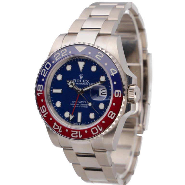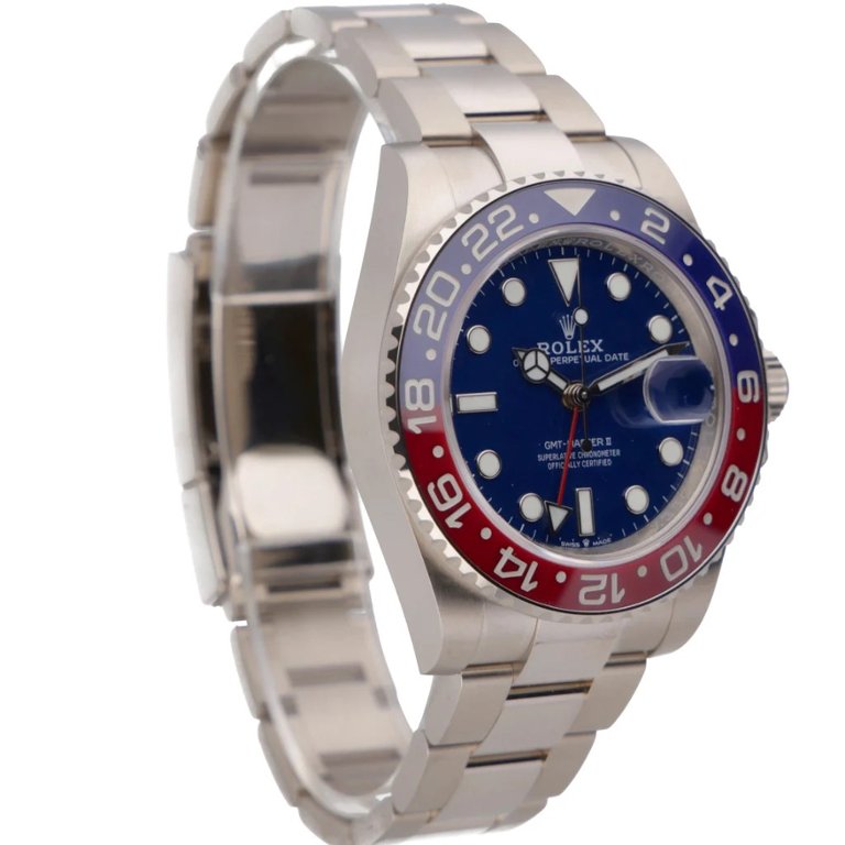 A Rolex GMT-Master II Watch, White Gold with a Red/Blue Bezel on a Blue Dial