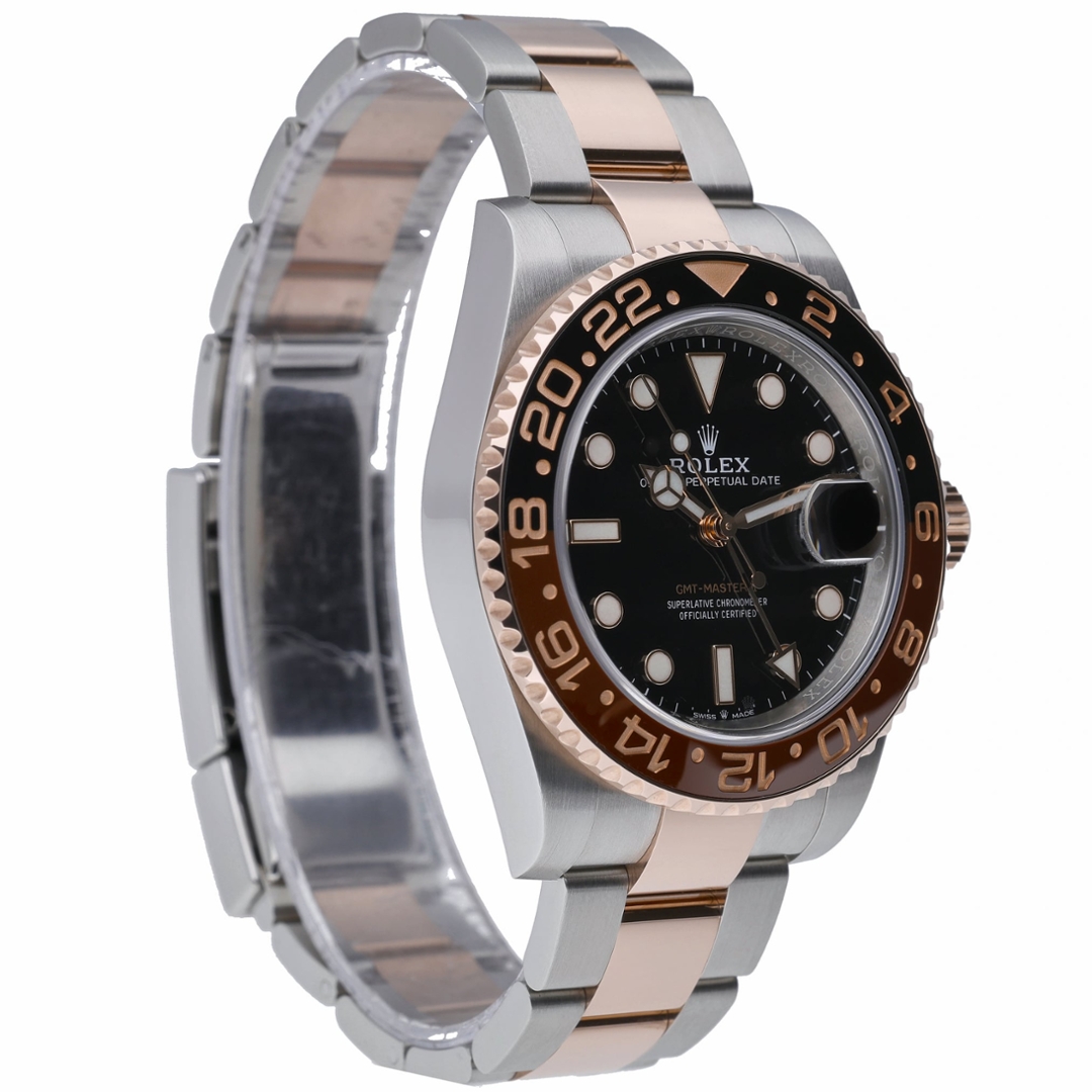 A Rolex GMT-Master II Watch, model 126711CHNR, presented in immaculate condition. This 2020 bi-metal reference is crafted from stainless steel and 18ct rose gold, featuring the distinctive black-and-brown Cerachrom bezel paired with a black dial and luminous hour markers. The 40mm case is fitted to the Oyster bracelet and powered by the Rolex Calibre 3285 automatic movement, offering dual time functionality with exceptional accuracy. Supplied with its original full set of paperwork, presentation box, and a 12-month WLC warranty.