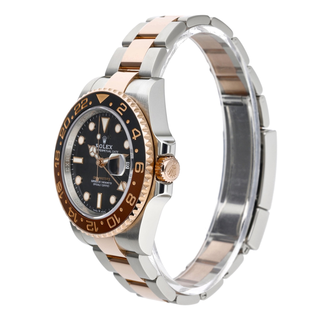 A Rolex GMT-Master II offers a refined and contemporary take on the brand’s iconic travel watch, combining stainless steel with 18ct rose gold for a distinctive bi-metal finish. The 40mm Oyster case is paired with a striking brown and black Cerachrom bezel, commonly known as the “Root Beer”, which adds warmth and depth to the overall design. A glossy black dial sits beneath, featuring luminous hour markers, Mercedes hands, and a rose gold GMT hand for clear second-time zone tracking.