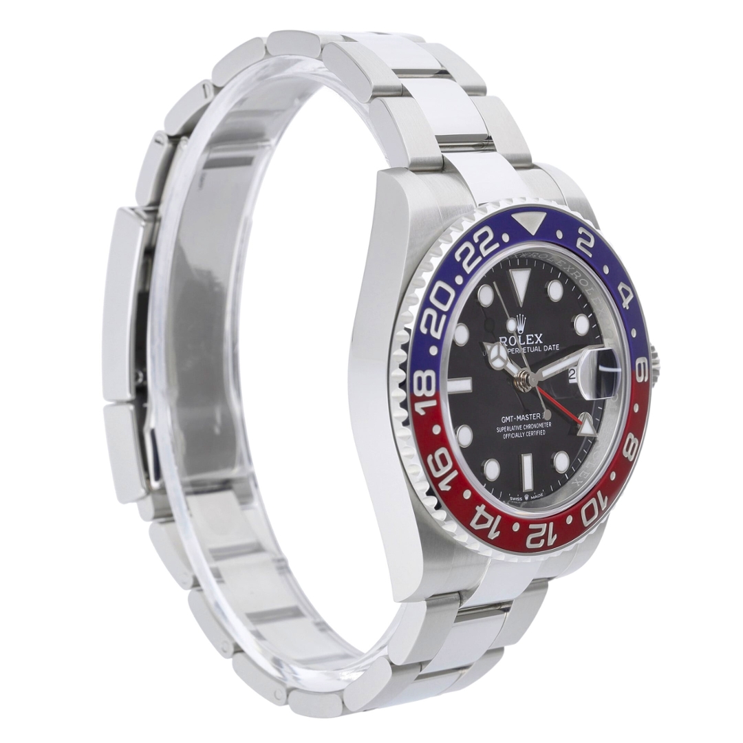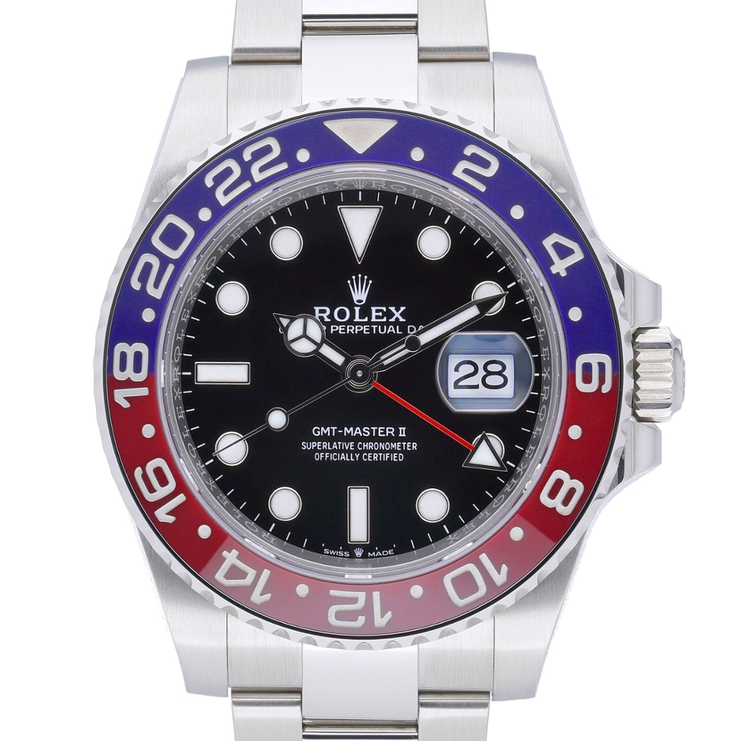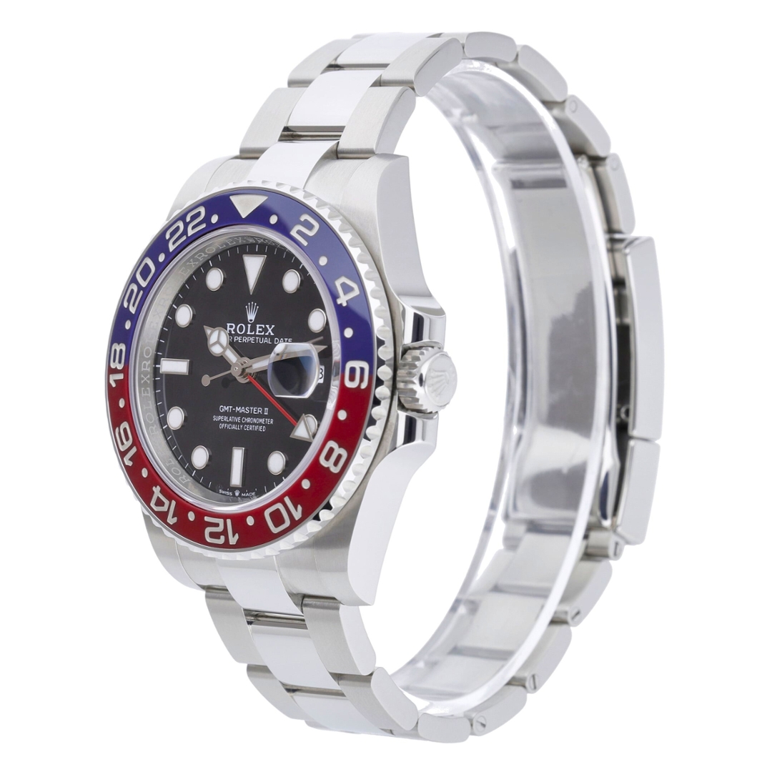 A Rolex GMT-Master II 126710BLRO in stainless steel, distinguished by its iconic blue and red Cerachrom bezel and black dial. Introduced as the modern evolution of the legendary “Pepsi,” this reference combines historic design cues with contemporary Rolex engineering, offering a balanced 40mm case that remains instantly recognisable and highly sought after.