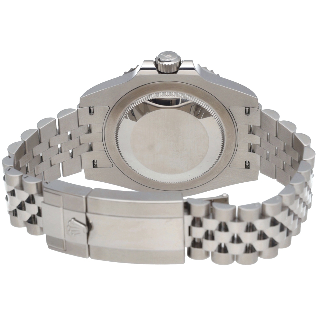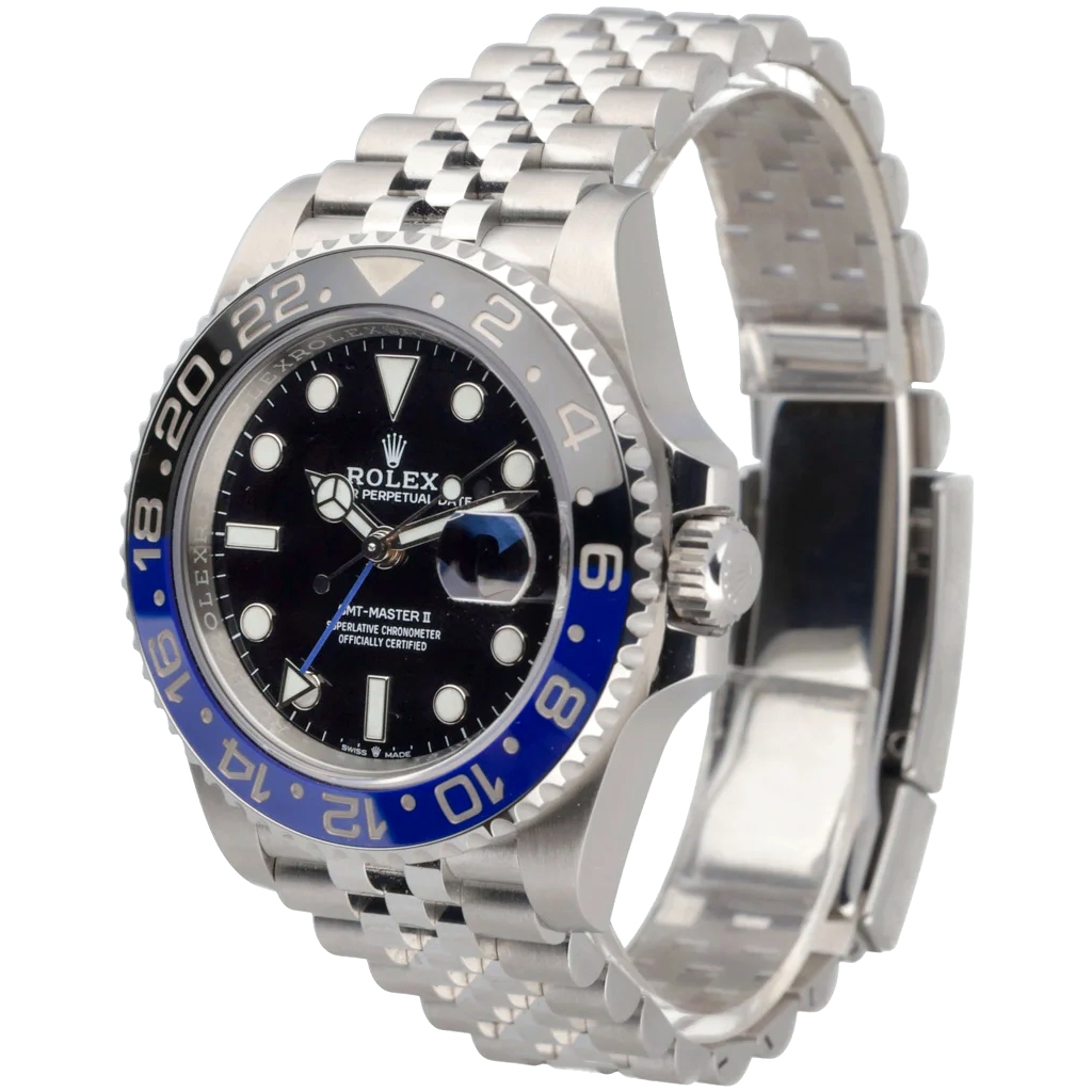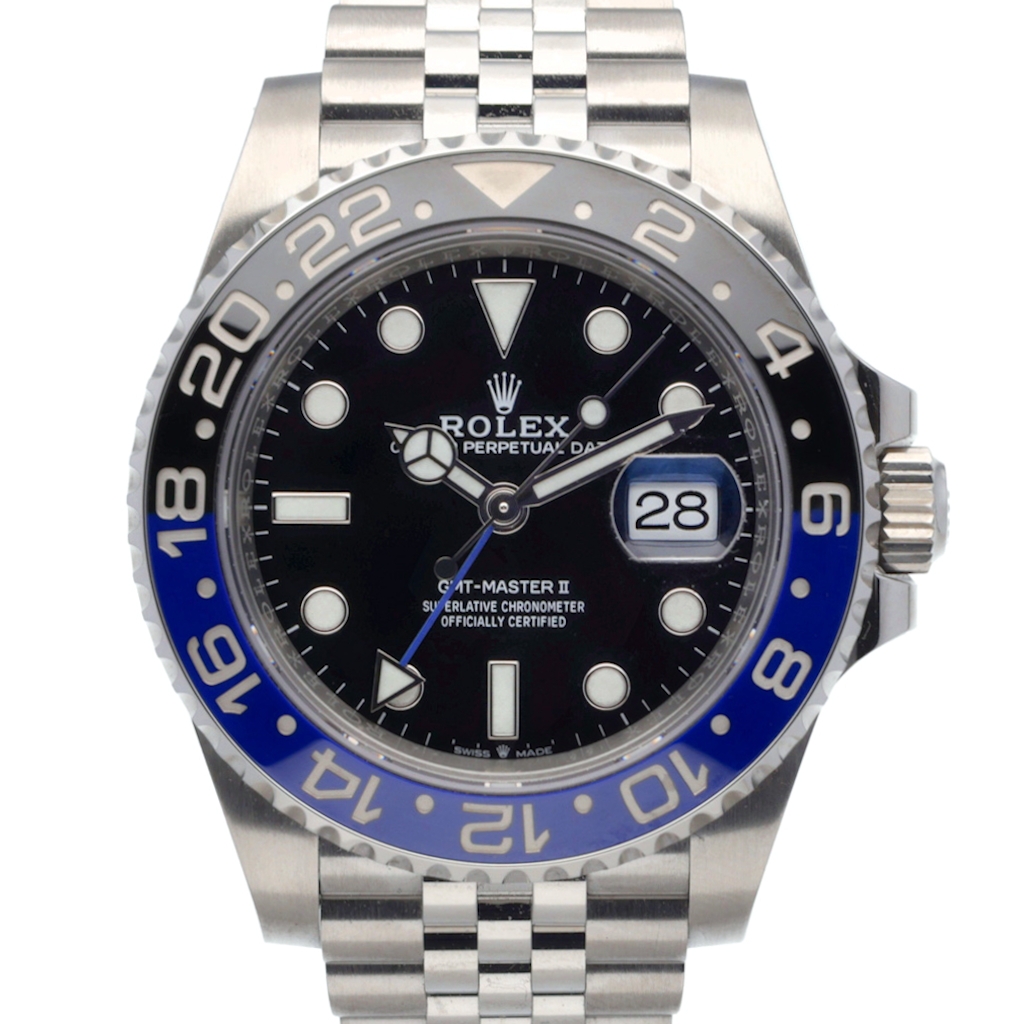 This Rolex GMT-Master II reference 126710BLNR is presented in immaculate condition, crafted in stainless steel with a 40mm Oyster case and fitted to the five-link Jubilee bracelet. The black dial is paired with the signature black-and-blue Cerachrom bezel, delivering strong visual contrast alongside applied luminous hour markers and Mercedes hands. The blue GMT hand enables clear second-time-zone tracking, reinforcing the model’s functional appeal.