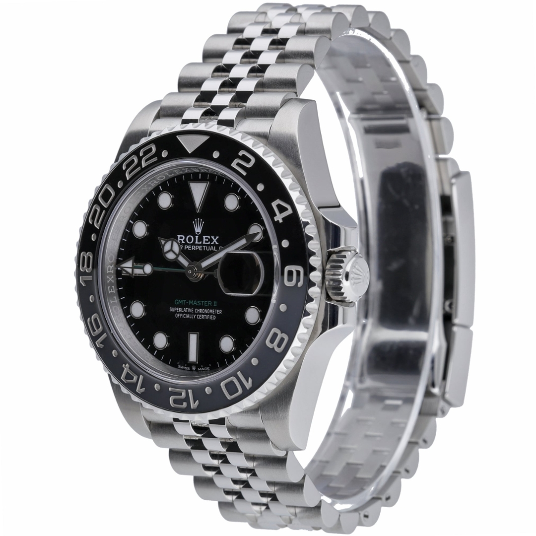 This Rolex GMT-Master II reference 126710GRNR is presented in stainless steel, featuring the striking black-and-grey Cerachrom bezel paired with a glossy black dial. The 40mm Oyster case is fitted to the Jubilee bracelet, offering a refined balance between sport and everyday wearability. Luminous hour markers, Mercedes hands and the signature green GMT hand provide clear legibility, while the date aperture at 3 o’clock is magnified by the Cyclops lens.