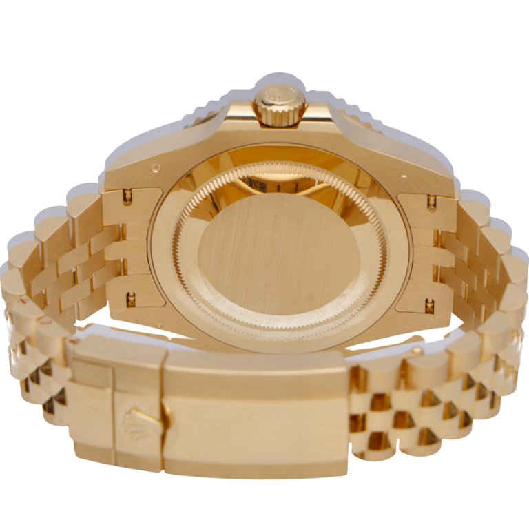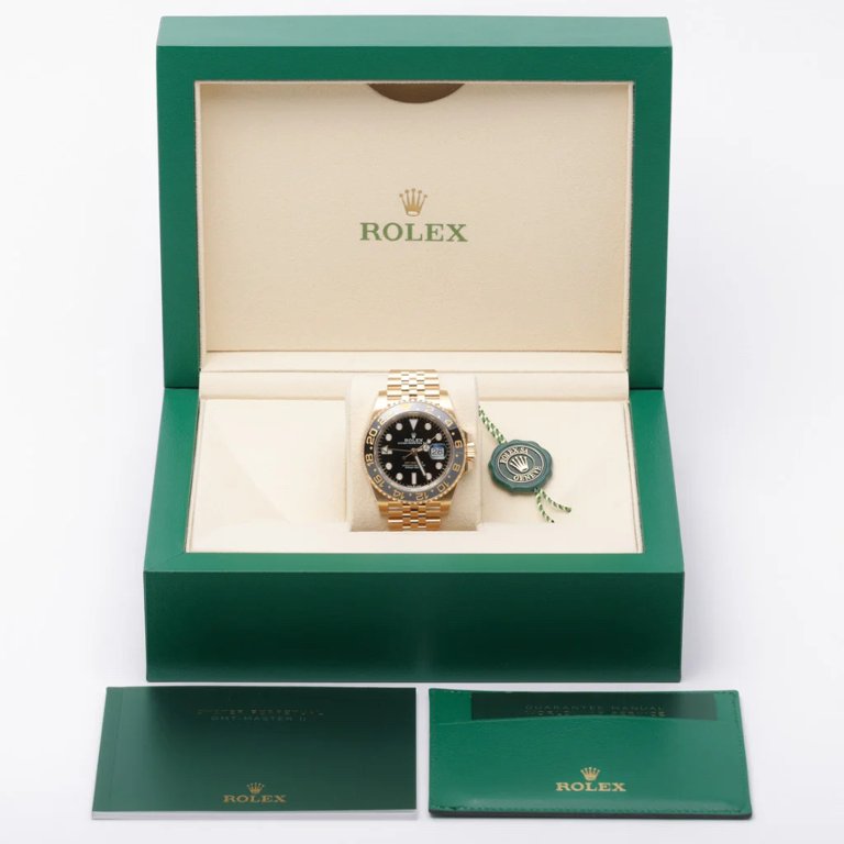 A Rolex GMT-Master II, model number 126718GRNR, is a luxurious embodiment of style and functionality, crafted entirely in 18ct yellow gold. This 2025 model stands out with its elegant 40mm case size, perfectly complemented by a striking black bezel and dial. The bezel is not just a visually appealing feature; it also serves a practical purpose, allowing simultaneous tracking of multiple time zones. This feature is invaluable for travellers and professionals alike.