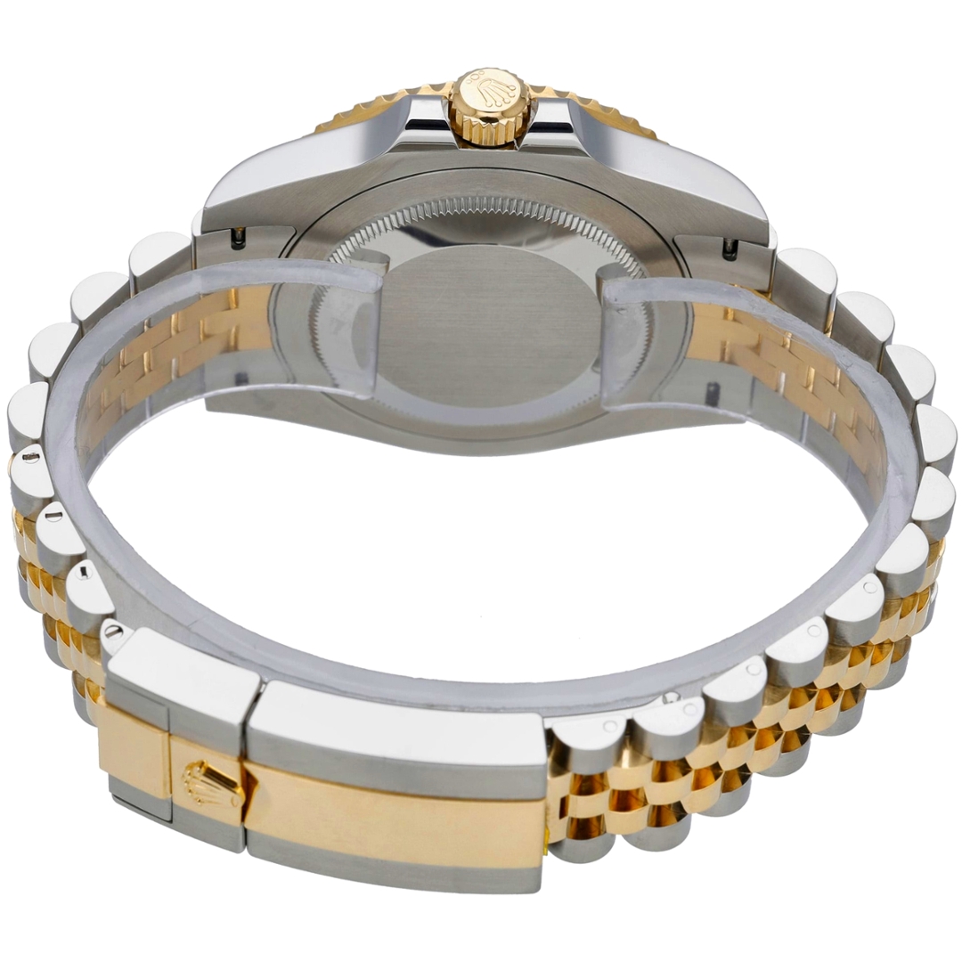 Its automatic movement ensures precision and reliability, a hallmark of Rolex's renowned craftsmanship. The black bezel with 24-hour graduations allows tracking multiple time zones, a nod to the watch's origins as a tool for international pilots. The 18ct yellow gold accents on the case, bracelet, and crown contrast beautifully with the stainless steel, adding a touch of luxury without compromising durability.