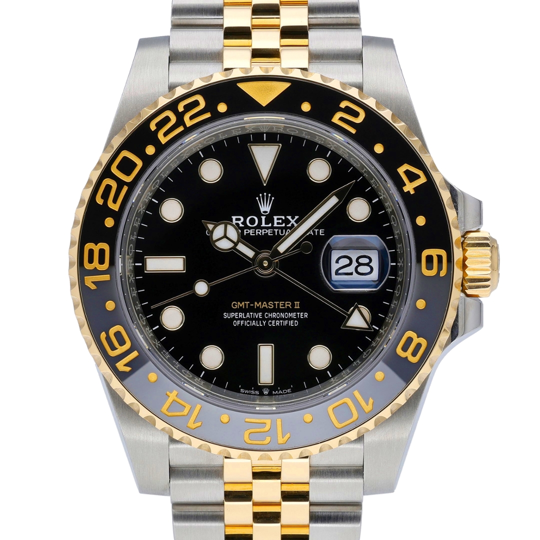 A Bi-Metal Rolex GMT-Master II Watch, Stainless Steel and 18ct Yellow Gold with a Black Bezel & Dial.