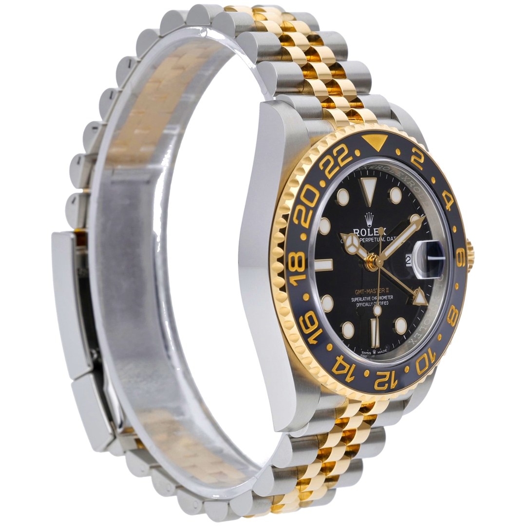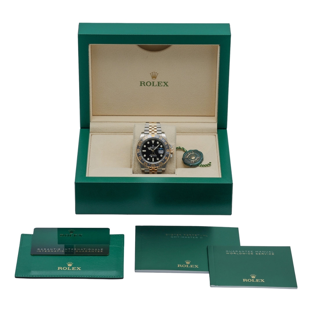 A Rolex GMT-Master II, model 126713GRNR, is a stunning bi-metal timepiece from 2024, combining the robustness of stainless steel with the luxury of 18ct yellow gold. This immaculate 40mm watch features an elegant black bezel and dial, exuding both sophistication and versatility, making it perfect for any occasion.