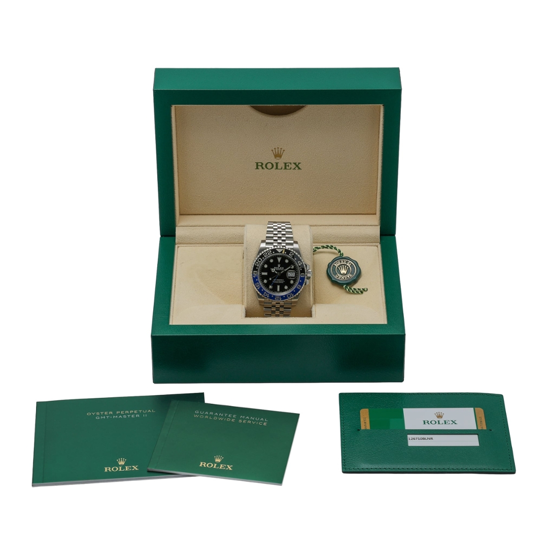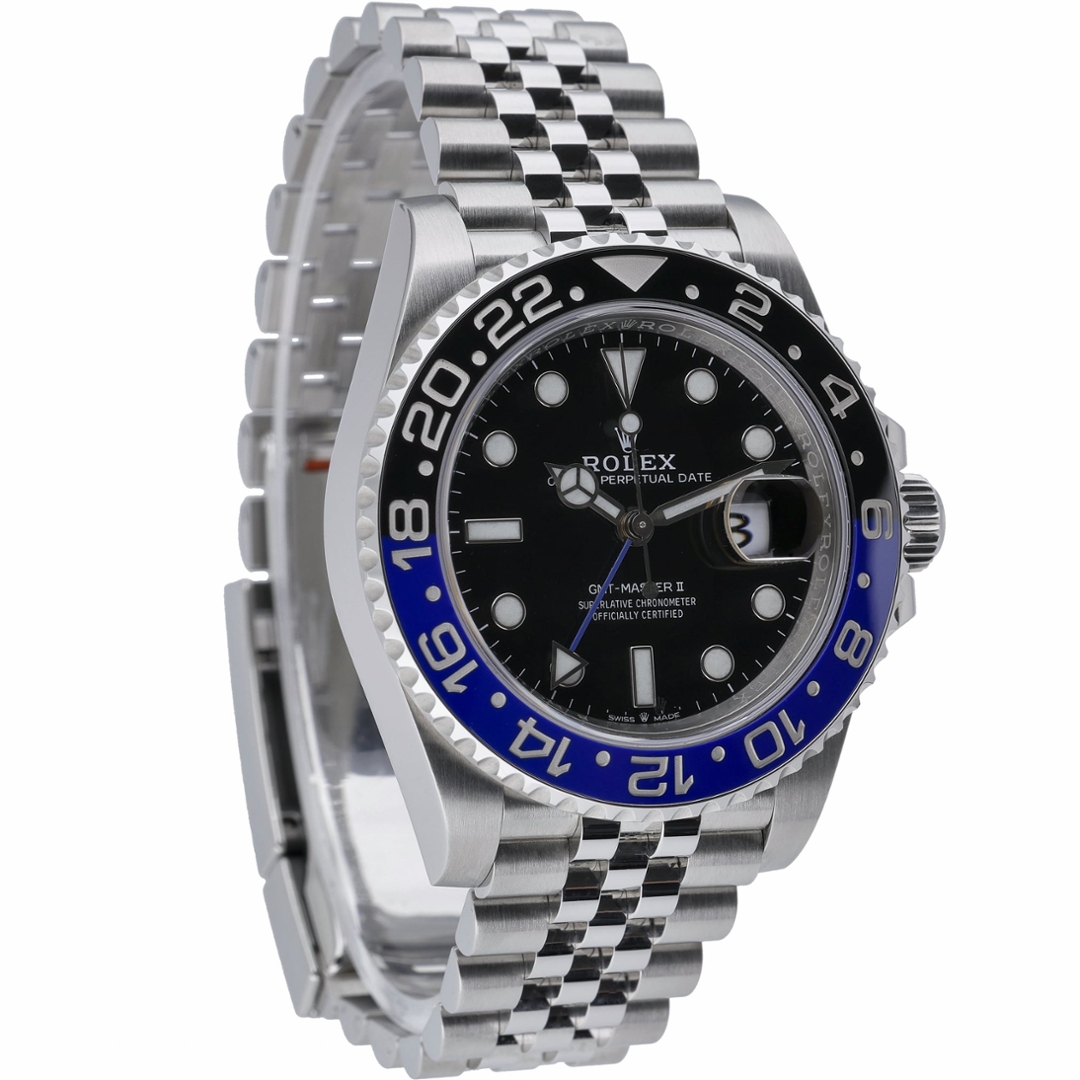 A Rolex GMT-Master II Watch, crafted in stainless steel, featuring the iconic black and blue Cerachrom ceramic bezel insert — often referred to as the "Batgirl." This 2020 model is fitted with a classic black dial, white luminous hour markers, and the recognisable Mercedes hands, offering superior legibility in all conditions. The 40mm Oyster case is water-resistant to 100 metres, secured with a Twinlock winding crown and scratch-resistant sapphire crystal.