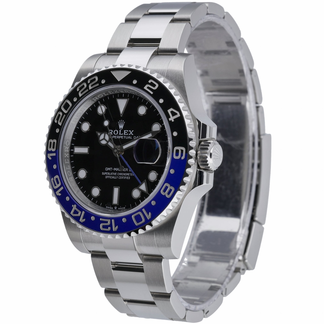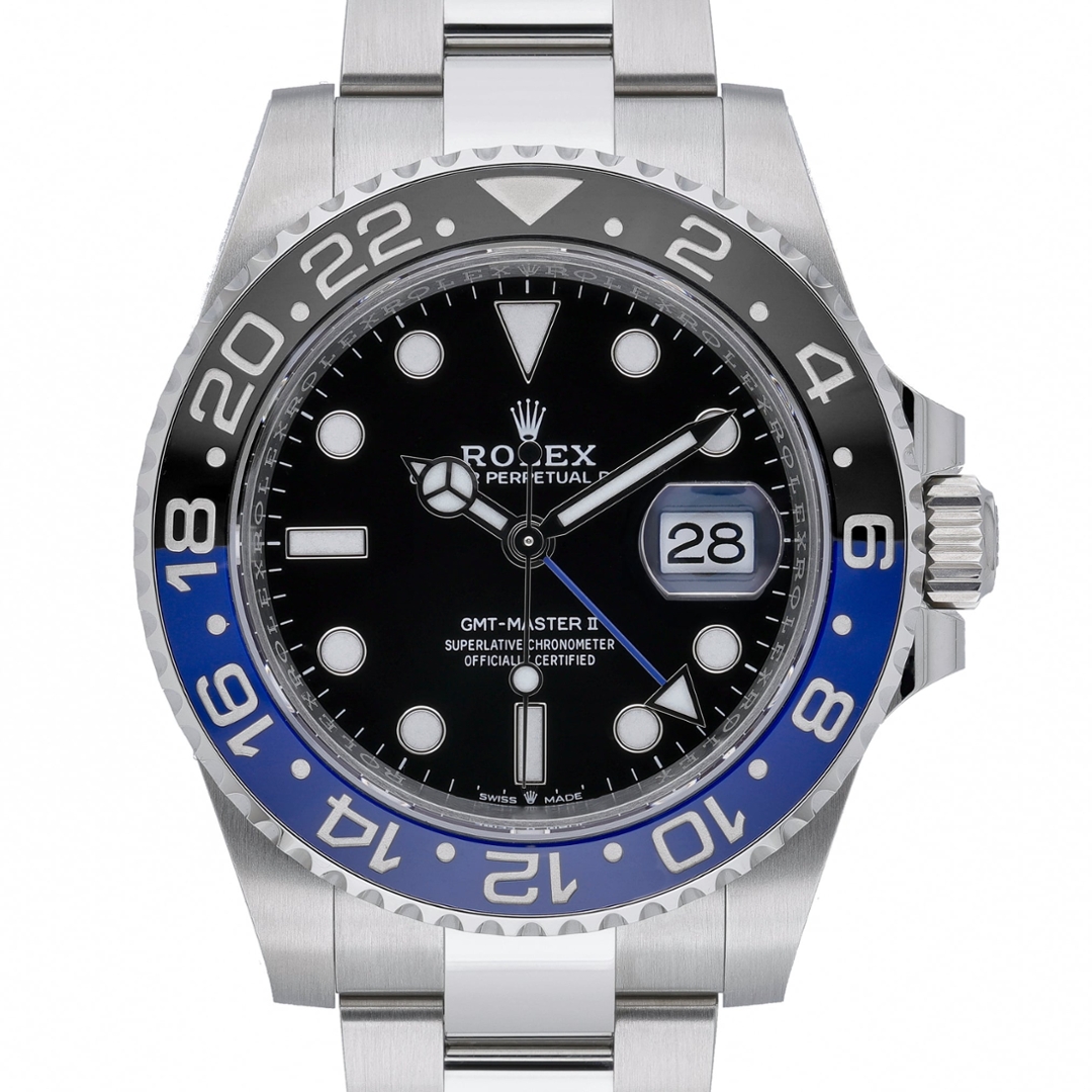 A Rolex GMT-Master II 126710BLNR, presented in stainless steel with the iconic black and blue Cerachrom bezel, widely known as the “Batman”. The 40mm Oyster case is paired with a robust bracelet, offering both durability and everyday versatility. The black dial features luminous hour markers and hands, complemented by the signature blue GMT hand, enabling tracking of a second time zone with exceptional clarity.
