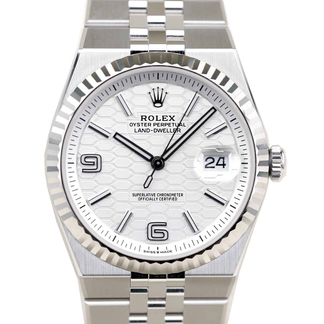 A Rolex Land-Dweller 40, reference 127334 (in the new 2025 Rolex Box), is crafted in Oystersteel and fitted with an 18ct white gold fluted bezel and a Flat Jubilee bracelet — a bold new entry in Rolex’s 2025 catalogue.
