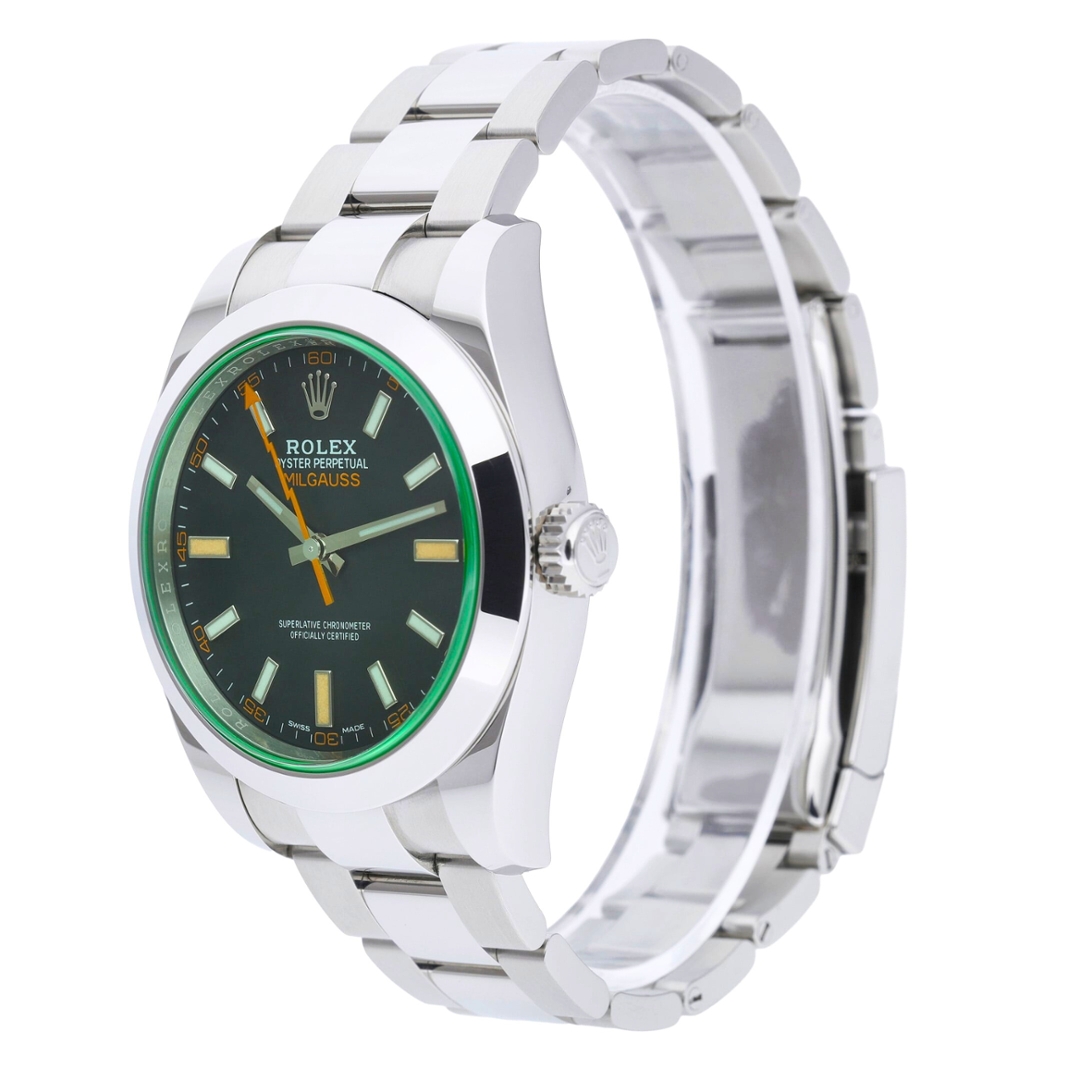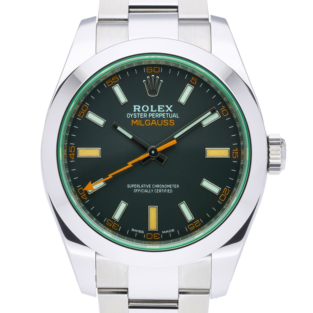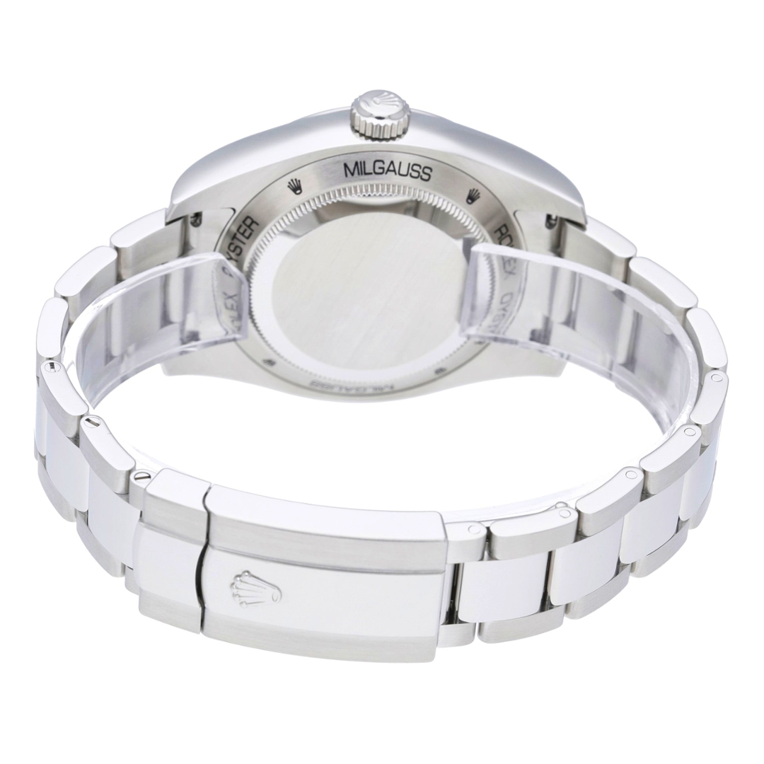 A Rolex Milgauss Watch that celebrates the perfect harmony of scientific innovation and striking design. Crafted from durable stainless steel, this model features the distinctive black dial enhanced by vivid orange accents and the signature lightning bolt seconds hand—a tribute to the model’s heritage as the engineer’s watch. The green-tinted sapphire crystal, unique to the Milgauss, adds a captivating visual depth while maintaining Rolex’s legendary scratch resistance and clarity.
