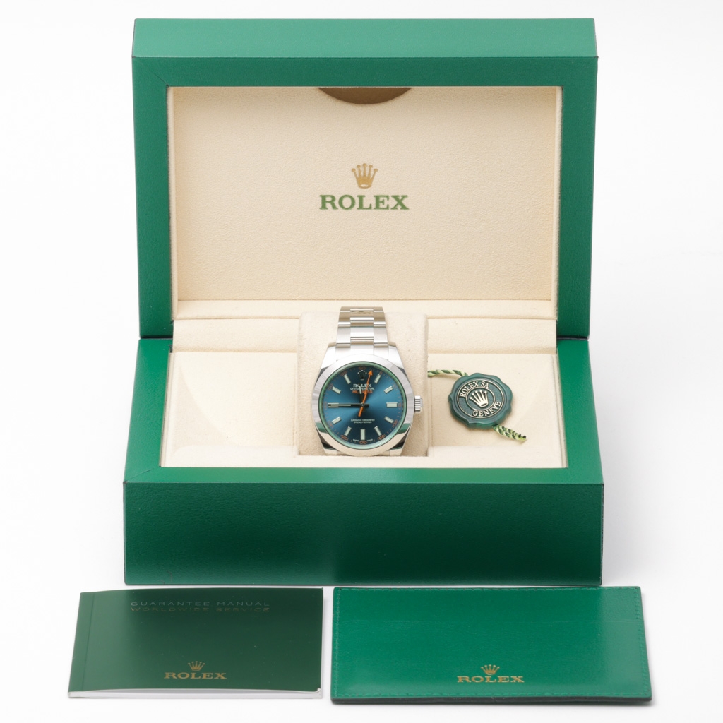 Described as being in immaculate condition, this Milgauss exemplifies meticulous care and maintenance, reflecting the enduring quality and craftsmanship inherent in Rolex timepieces. Backed by a 12-month WLC warranty and accompanied by the original full set of paperwork, boxed and certified, this watch offers both assurance and authenticity to its discerning owner.