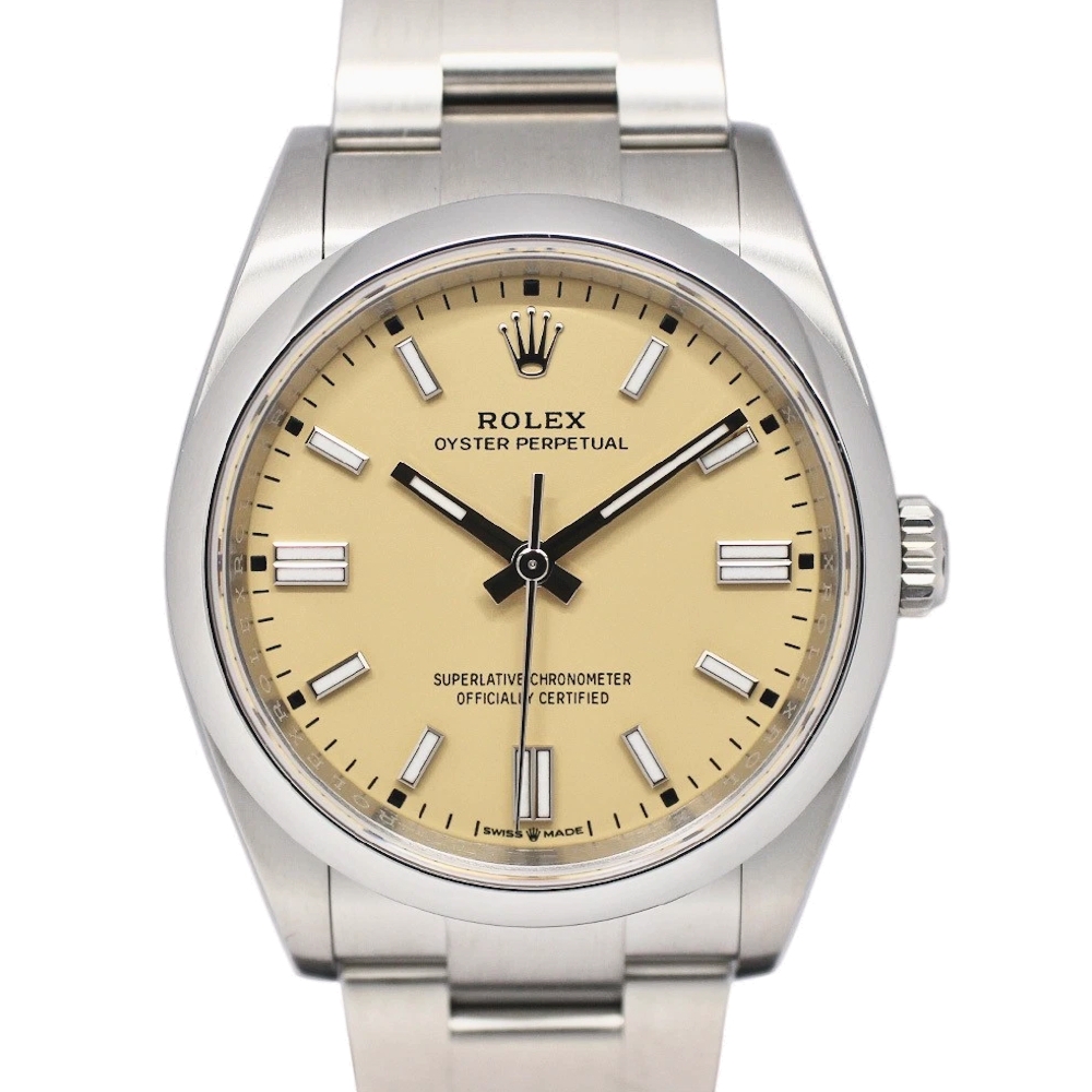 A Rolex Oyster Perpetual 36, reference 126000, crafted in stainless steel and dated 2025. This model features a 36mm Oyster case paired with a smooth bezel and an Oyster bracelet, offering a balanced mix of durability and refined design. The beige dial is set with baton hour markers and Chromalight luminescence, providing excellent legibility in all lighting conditions.