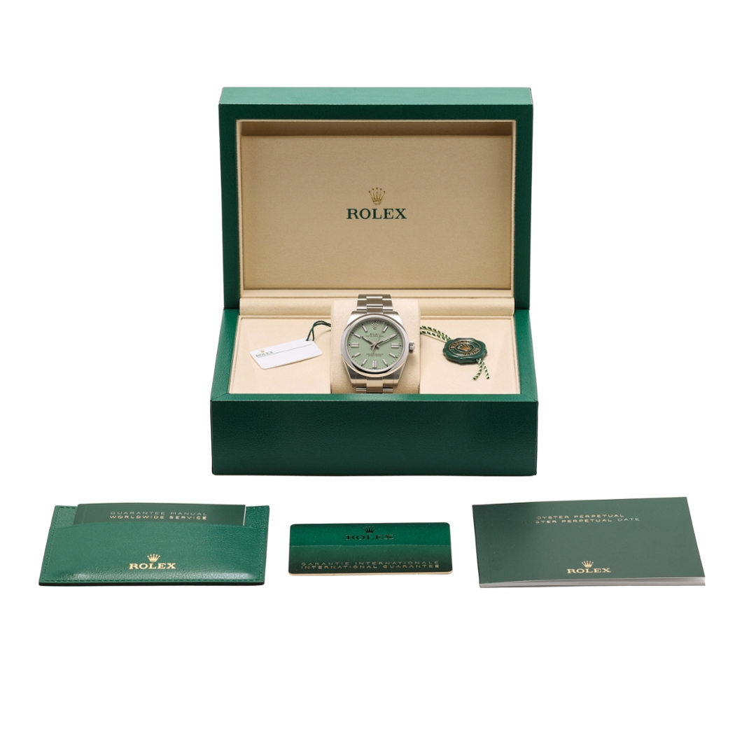 Presented in immaculate condition, this example comes as a complete full set, with its original Rolex box, paperwork, and manufacturer warranty valid until 2030. The pistachio dial variant of the Oyster Perpetual 41 has become one of the most sought-after configurations in recent years, admired for its fresh, distinctive tone and strong market demand. A watch that perfectly captures the spirit of modern Rolex — refined, versatile, and effortlessly collectable.