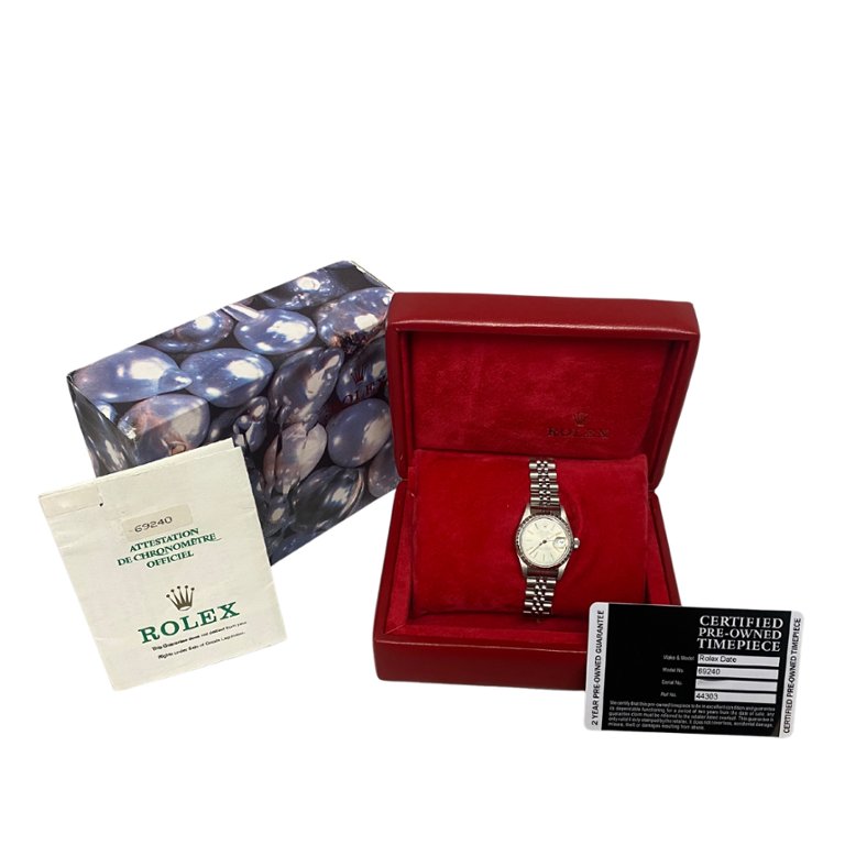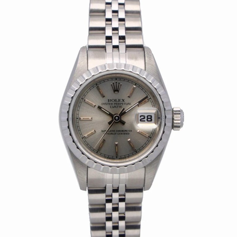 A Rolex Oyster Perpetual Date reference 69240 in stainless steel with a silver dial and fluted bezel. The 26mm Oyster case offers classic proportions, making it an ideal choice for those who appreciate refined, understated Rolex design. The silver dial is complemented by applied baton hour markers and a date aperture at 3 o’clock with a Cyclops lens, delivering clean symmetry and excellent legibility. The Jubilee bracelet completes the look with comfort and timeless versatility.