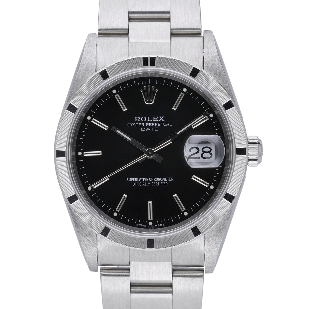 A Rolex Oyster Perpetual Date Watch in stainless steel, featuring the classic black dial that highlights the understated elegance of this versatile Rolex model. The 34mm Oyster case delivers balanced proportions that sit comfortably on the wrist, while the engine-turned bezel adds a distinctive textured detail that sets this reference apart from more traditional smooth or fluted designs.