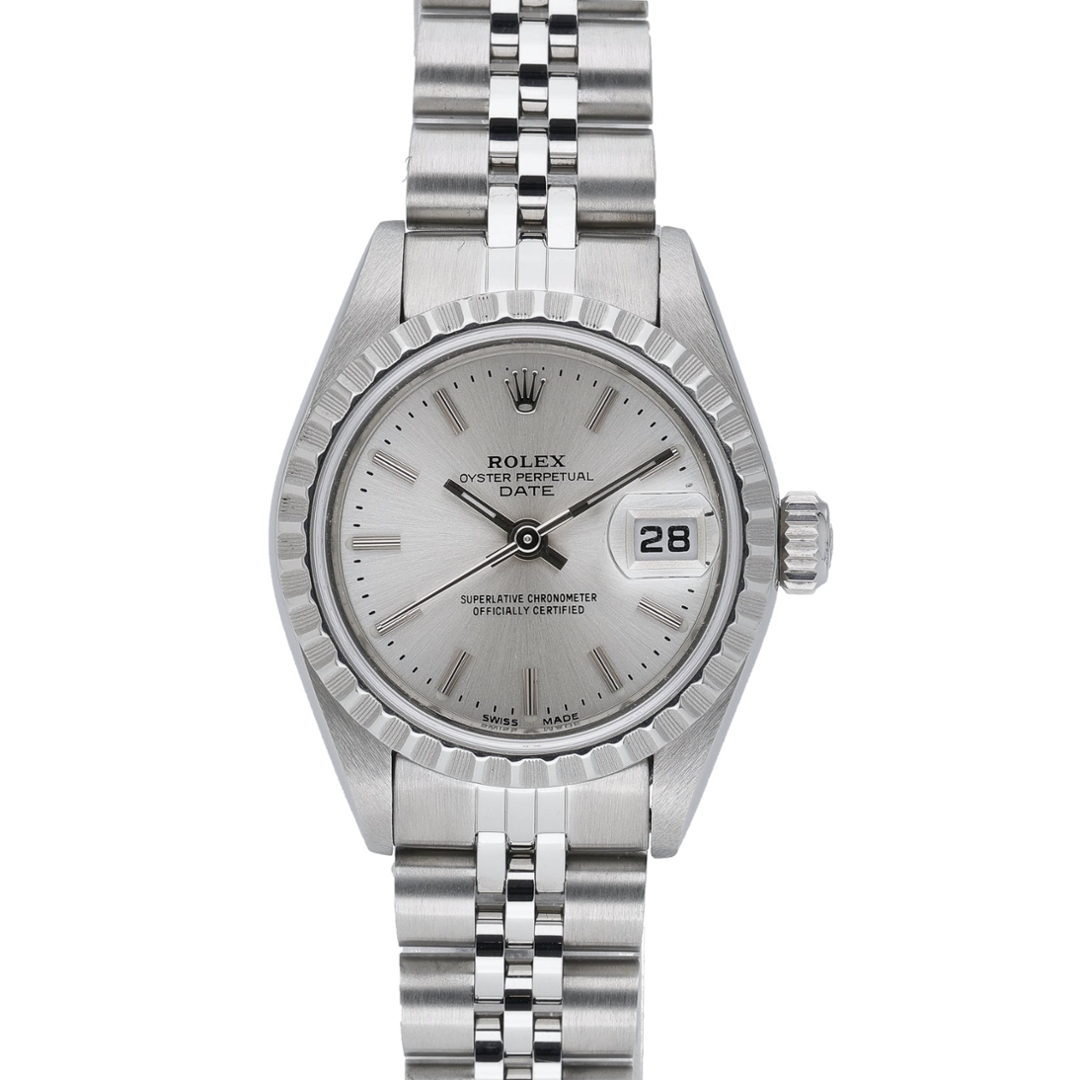 A Rolex Oyster Perpetual Date presented in stainless steel with a silver sunburst dial, featuring applied baton hour markers and matching hands. The 26mm Oyster case offers a refined and timeless profile, complemented by a date display at 3 o’clock with the signature Cyclops lens for enhanced legibility. The clean dial layout and classic proportions make this an elegant and versatile choice within the Rolex range.