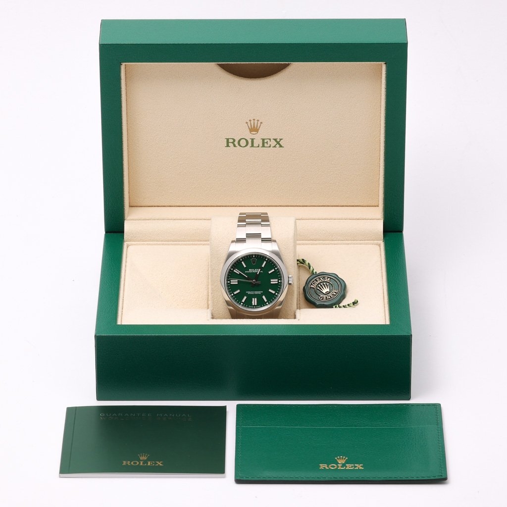 The striking green dial adds a bold, contemporary twist to the classic design, enhanced by baton hour markers and polished hands for exceptional clarity. With no date display, the dial remains perfectly balanced, true to Oyster Perpetual's pure and uncluttered design philosophy.
