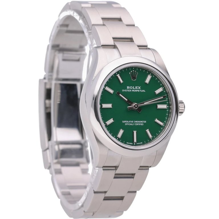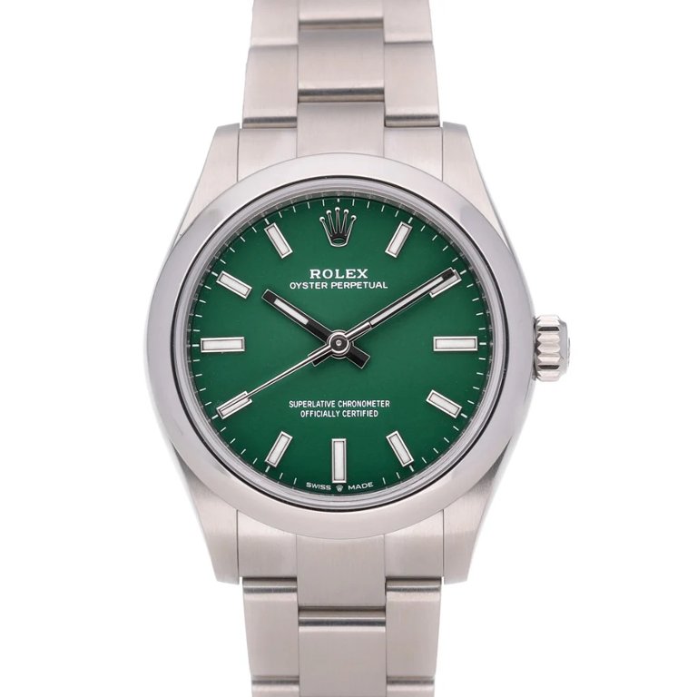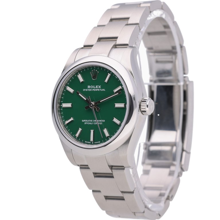 A Rolex Oyster Perpetual 277200, crafted in stainless steel with a captivating green dial, epitomises the pinnacle of horological excellence and timeless elegance. Introduced in 2020, this 31mm timepiece exemplifies Rolex's mastery in watchmaking, blending precision engineering with exquisite design.