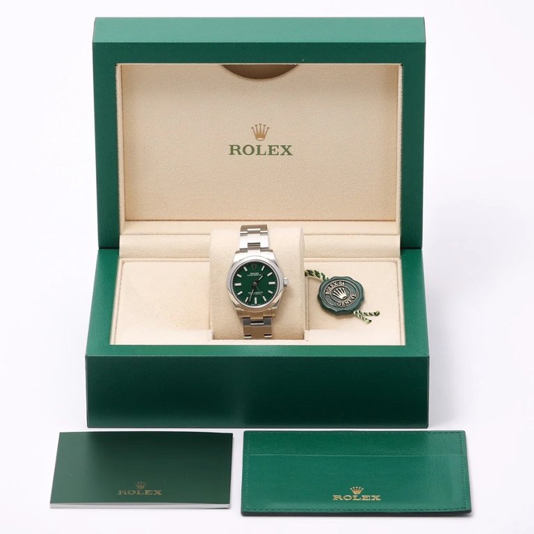 A Rolex Oyster Perpetual Watch, Stainless Steel with a Green Dial.