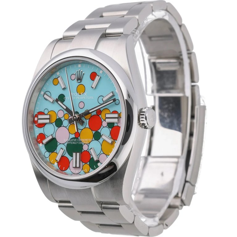The dial of the Rolex Oyster Perpetual is a mesmerising canvas, adorned with a vibrant Turquoise Blue Celebration Motif that captivates the eye with its dynamic and celebratory design. Reminiscent of confetti scattered against a clear blue sky, the motif evokes feelings of joy and excitement, making it the perfect companion for life's most memorable moments. This unique dial serves as a testament to Rolex's commitment to innovation and creativity, pushing the boundaries of traditional watchmaking to create something truly extraordinary.