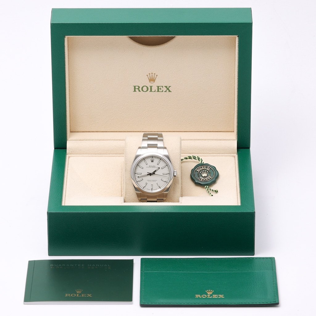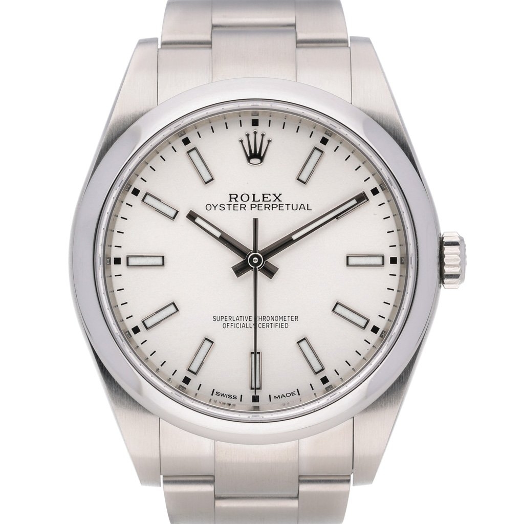 A Rolex Oyster Perpetual 114300 is a stunning example of Rolex's commitment to timeless elegance and precision. Introduced in 2019, this model stands out with its 39mm stainless steel case, offering a sophisticated, versatile size that complements both casual and formal attire. The watch features a pristine white dial with a classic, clean aesthetic, enhanced by luminous hour markers and hands, ensuring readability in various lighting conditions.