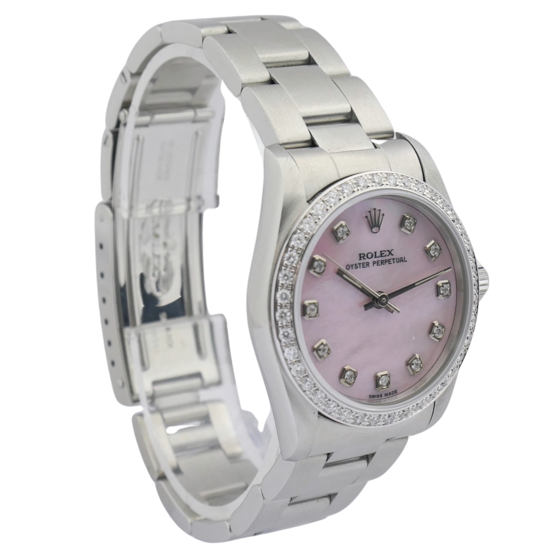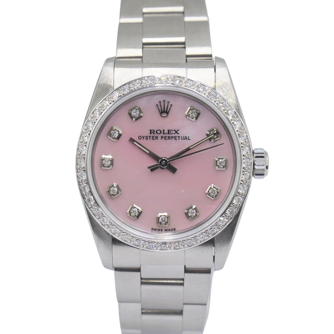 A Rolex Oyster Perpetual Watch that perfectly captures elegance and individuality. Crafted from stainless steel, this striking timepiece features a stunning afterset pink mother-of-pearl dial adorned with diamond hour markers, exuding both sophistication and charm. The watch is further enhanced by an afterset diamond bezel, adding a luxurious sparkle while maintaining the timeless character of the Oyster Perpetual design. Included with this piece are the original Rolex bezel and dial, allowing collectors to restore it to its factory specification if desired.