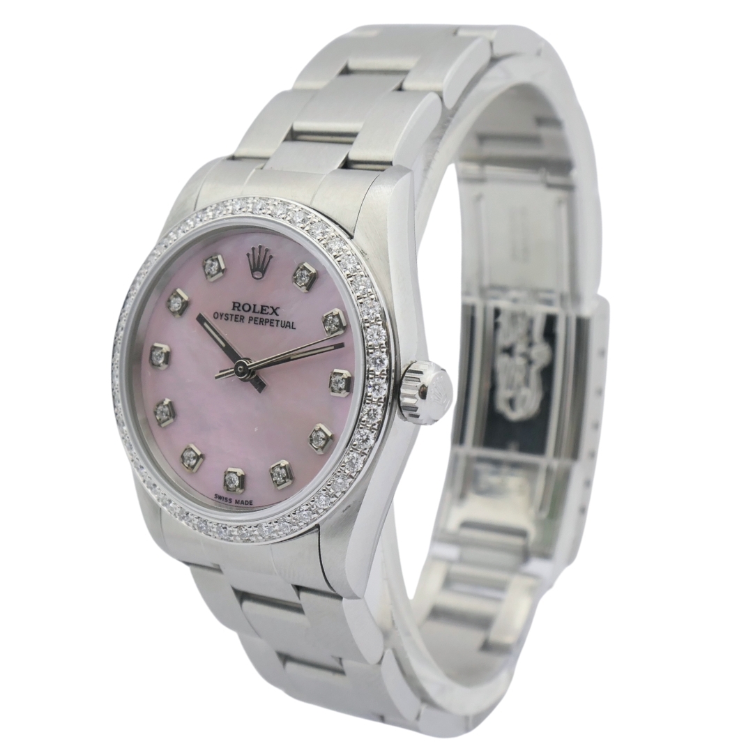 A Rolex Oyster Perpetual Watch, Stainless Steel with an Afterset Diamond Bezel on an Afterset Pink Mother of Pearl Dial with Diamond Numerals (Accompanied by the Original Bezel & Dial)