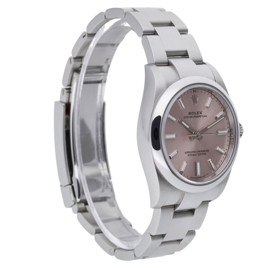 A Rolex Oyster Perpetual, model 124200, is the embodiment of timeless simplicity and enduring Rolex quality. Crafted entirely from stainless steel, this 34mm model showcases a sleek, balanced design that exudes understated sophistication. The pink sunray-finish dial adds a soft, contemporary touch, enhanced by white gold baton hour markers and matching hands that ensure exceptional clarity and elegance. Its minimalist aesthetic captures the spirit of Rolex’s original Oyster design — a perfect fusion of form and function.