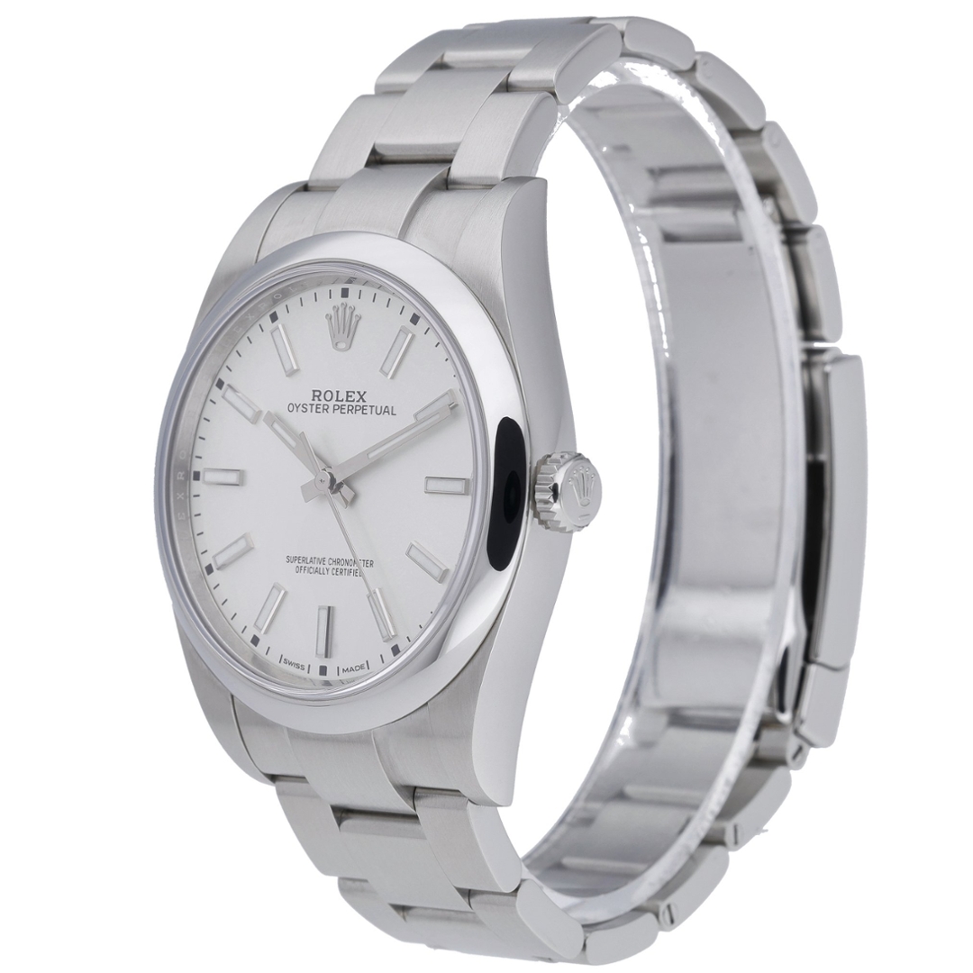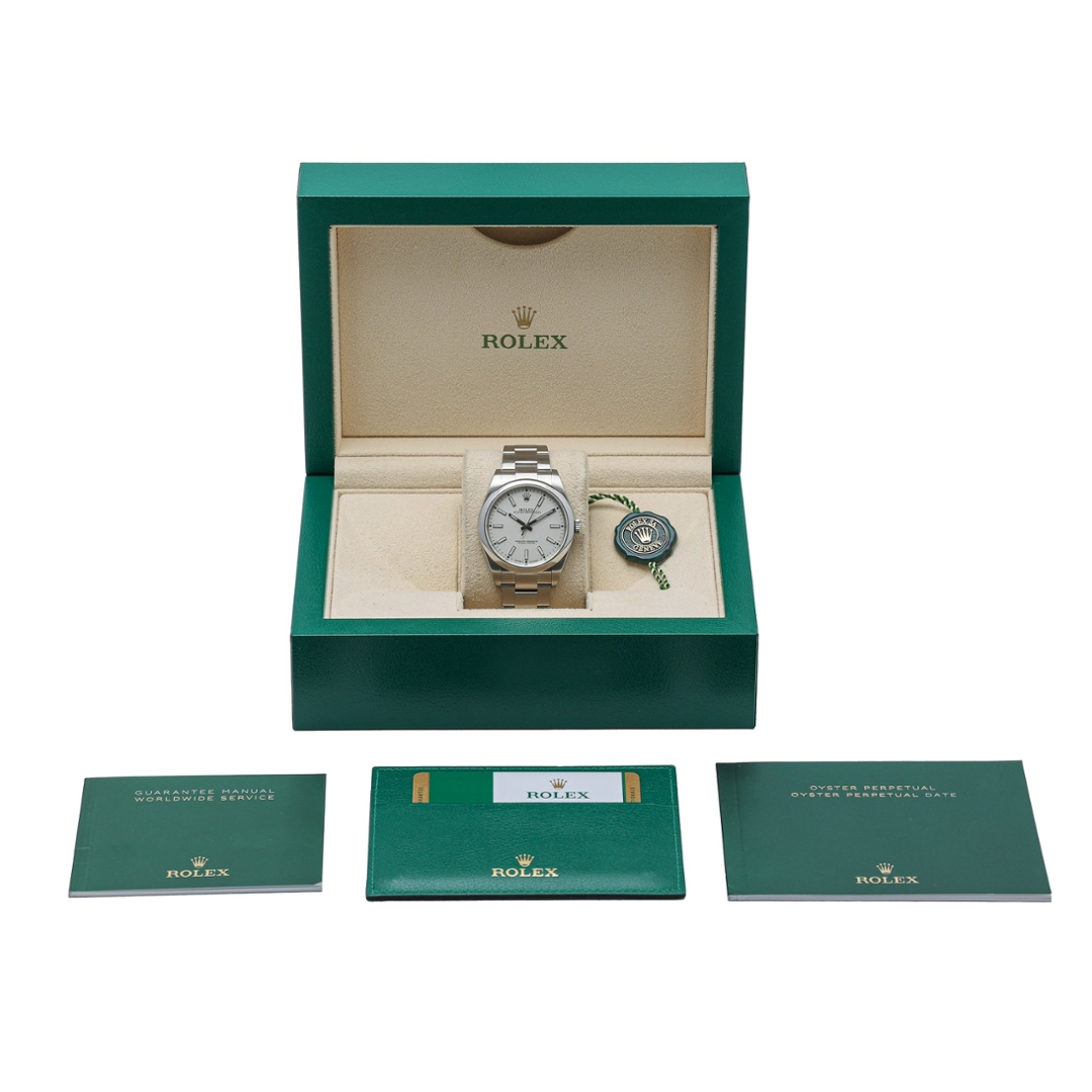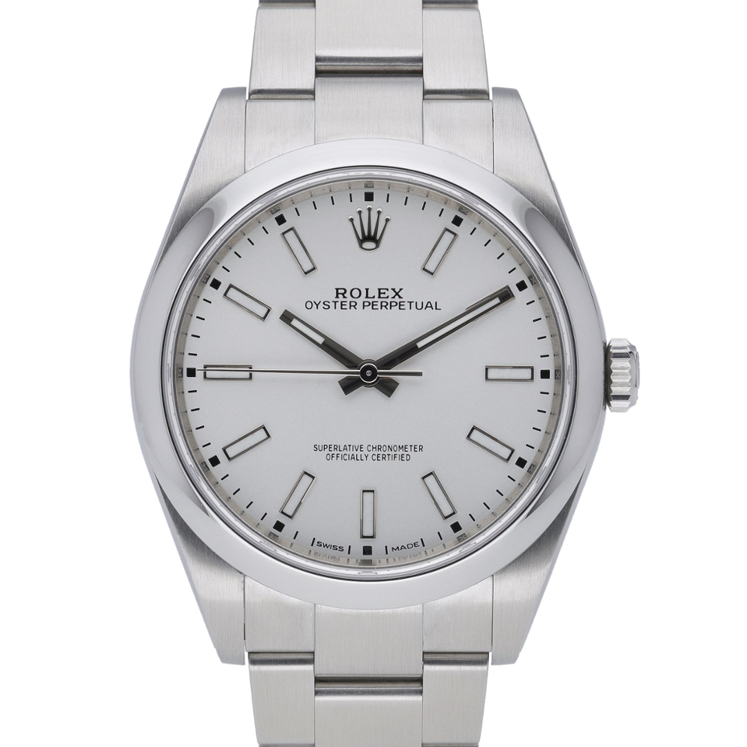 A Rolex Oyster Perpetual 114300 is a stunning example of Rolex's commitment to timeless elegance and precision. Introduced in 2019, this model stands out with its 39mm stainless steel case, offering a sophisticated, versatile size that complements both casual and formal attire. The watch features a pristine white dial with a classic, clean aesthetic, enhanced by luminous hour markers and hands, ensuring readability in various lighting conditions.