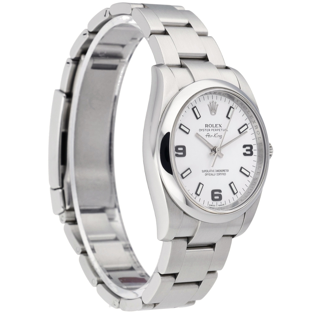 A Rolex Air-King 114200, crafted entirely from stainless steel and featuring a crisp white dial, offers timeless simplicity and refined sportiness in one of Rolex’s most understated designs. The 34mm Oyster case provides perfect proportions for both men and women, embodying the versatility and balance that define the Air-King collection.