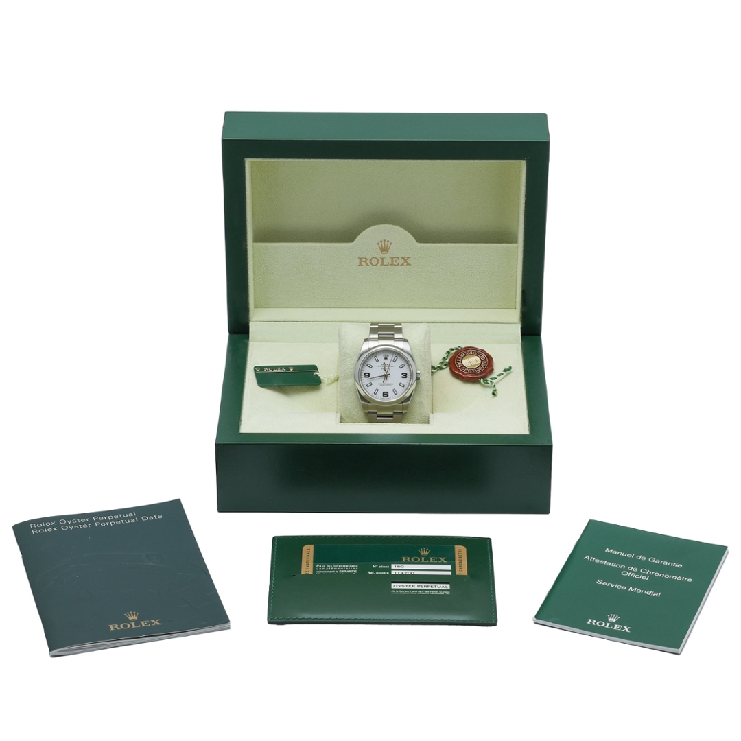 Powered by the Rolex Calibre 3130 automatic movement, this watch delivers precision, reliability, and smooth performance, officially certified as a Superlative Chronometer. The clear white dial is beautifully accented by bold Arabic numerals at 3, 6, and 9, complemented by luminous baton hour markers that ensure readability in all conditions. The signature Oyster bracelet and robust clasp guarantee both comfort and durability, making it ideal for everyday wear.